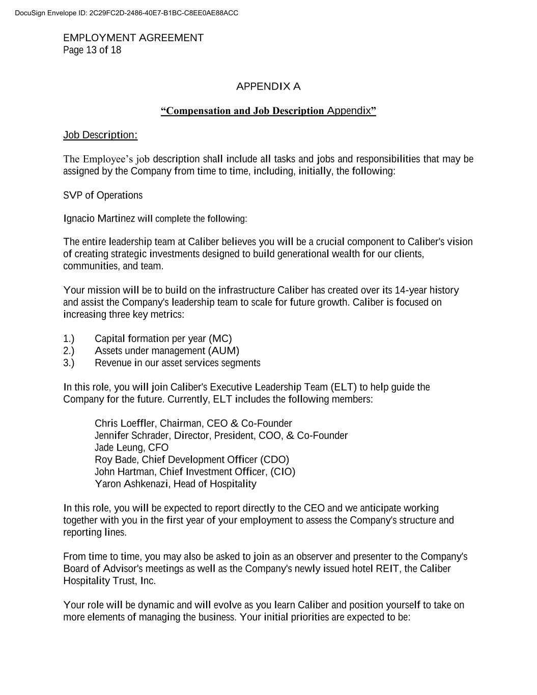 EMPLOYMENT AGREEMENT Page 13 of 18 APPENDIX A “Compensation and Job Description Appendix” Job Description: The Employee’s job description shall include all tasks and jobs and responsibilities that may be assigned by the Company from time to time, including, initially, the following: SVP of Operations Ignacio Martinez will complete the following: The entire leadership team at Caliber believes you will be a crucial component to Caliber's vision of creating strategic investments designed to build generational wealth for our clients, communities, and team. Your mission will be to build on the infrastructure Caliber has created over its 14-year history and assist the Company's leadership team to scale for future growth. Caliber is focused on increasing three key metrics: 1.) Capital formation per year (MC) 2.) Assets under management (AUM) 3.) Revenue in our asset services segments In this role, you will join Caliber's Executive Leadership Team (ELT) to help guide the Company for the future. Currently, ELT includes the following members: Chris Loeffler, Chairman, CEO & Co-Founder Jennifer Schrader, Director, President, COO, & Co-Founder Jade Leung, CFO Roy Bade, Chief Development Officer (CDO) John Hartman, Chief Investment Officer, (CIO) Yaron Ashkenazi, Head of Hospitality In this role, you will be expected to report directly to the CEO and we anticipate working together with you in the first year of your employment to assess the Company's structure and reporting lines. From time to time, you may also be asked to join as an observer and presenter to the Company's Board of Advisor's meetings as well as the Company's newly issued hotel REIT, the Caliber Hospitality Trust, Inc. Your role will be dynamic and will evolve as you learn Caliber and position yourself to take on more elements of managing the business. Your initial priorities are expected to be: DocuSign Envelope ID: 2C29FC2D-2486-40E7-B1BC-C8EE0AE88ACC