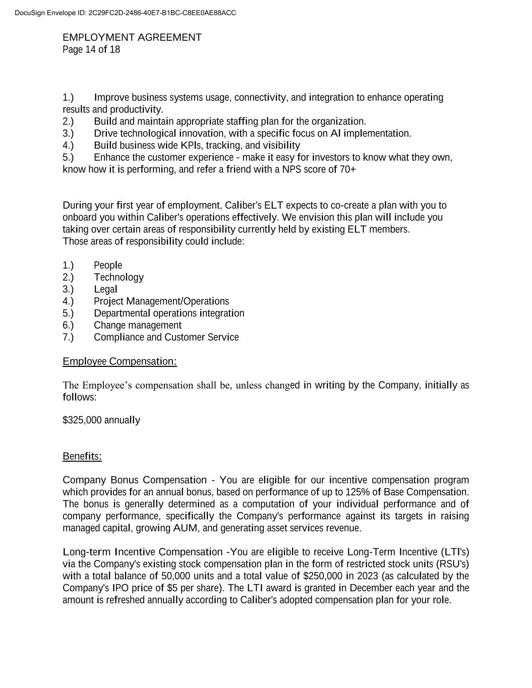 EMPLOYMENT AGREEMENT Page 14 of 18 1.) Improve business systems usage, connectivity, and integration to enhance operating results and productivity. 2.) Build and maintain appropriate staffing plan for the organization. 3.) Drive technological innovation, with a specific focus on Al implementation. 4.) Build business wide KPls, tracking, and visibility 5.) Enhance the customer experience - make it easy for investors to know what they own, know how it is performing, and refer a friend with a NPS score of 70+ During your first year of employment, Caliber's ELT expects to co-create a plan with you to onboard you within Caliber's operations effectively. We envision this plan will include you taking over certain areas of responsibility currently held by existing ELT members. Those areas of responsibility could include: 1.) People 2.) Technology 3.) Legal 4.) Project Management/Operations 5.) Departmental operations integration 6.) Change management 7.) Compliance and Customer Service Employee Compensation: The Employee’s compensation shall be, unless changed in writing by the Company, initially as follows: $325,000 annually Benefits: Company Bonus Compensation - You are eligible for our incentive compensation program which provides for an annual bonus, based on performance of up to 125% of Base Compensation. The bonus is generally determined as a computation of your individual performance and of company performance, specifically the Company's performance against its targets in raising managed capital, growing AUM, and generating asset services revenue. Long-term Incentive Compensation -You are eligible to receive Long-Term Incentive (LTl's) via the Company's existing stock compensation plan in the form of restricted stock units (RSU's) with a total balance of 50,000 units and a total value of $250,000 in 2023 (as calculated by the Company's IPO price of $5 per share). The LTI award is granted in December each year and the amount is refreshed annually according to Caliber's adopted compensation plan for your role. DocuSign Envelope ID: 2C29FC2D-2486-40E7-B1BC-C8EE0AE88ACC