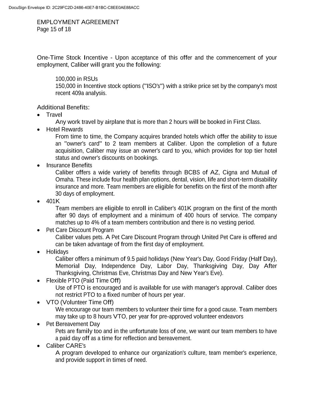 EMPLOYMENT AGREEMENT Page 15 of 18 One-Time Stock Incentive - Upon acceptance of this offer and the commencement of your employment, Caliber will grant you the following: 100,000 in RSUs 150,000 in Incentive stock options ("ISO's") with a strike price set by the company's most recent 409a analysis. Additional Benefits:  Travel Any work travel by airplane that is more than 2 hours will be booked in First Class.  Hotel Rewards From time to time, the Company acquires branded hotels which offer the ability to issue an "owner's card" to 2 team members at Caliber. Upon the completion of a future acquisition, Caliber may issue an owner's card to you, which provides for top tier hotel status and owner's discounts on bookings.  Insurance Benefits Caliber offers a wide variety of benefits through BCBS of AZ, Cigna and Mutual of Omaha. These include four health plan options, dental, vision, life and short-term disability insurance and more. Team members are eligible for benefits on the first of the month after 30 days of employment.  401K Team members are eligible to enroll in Caliber's 401K program on the first of the month after 90 days of employment and a minimum of 400 hours of service. The company matches up to 4% of a team members contribution and there is no vesting period.  Pet Care Discount Program Caliber values pets. A Pet Care Discount Program through United Pet Care is offered and can be taken advantage of from the first day of employment.  Holidays Caliber offers a minimum of 9.5 paid holidays (New Year's Day, Good Friday (Half Day), Memorial Day, Independence Day, Labor Day, Thanksgiving Day, Day After Thanksgiving, Christmas Eve, Christmas Day and New Year's Eve).  Flexible PTO (Paid Time Off) Use of PTO is encouraged and is available for use with manager's approval. Caliber does not restrict PTO to a fixed number of hours per year.  VTO (Volunteer Time Off) We encourage our team members to volunteer their time for a good cause. Team members may take up to 8 hours VTO, per year for pre-approved volunteer endeavors  Pet Bereavement Day Pets are family too and in the unfortunate loss of one, we want our team members to have a paid day off as a time for reflection and bereavement.  Caliber CARE's A program developed to enhance our organization's culture, team member's experience, and provide support in times of need. DocuSign Envelope ID: 2C29FC2D-2486-40E7-B1BC-C8EE0AE88ACC