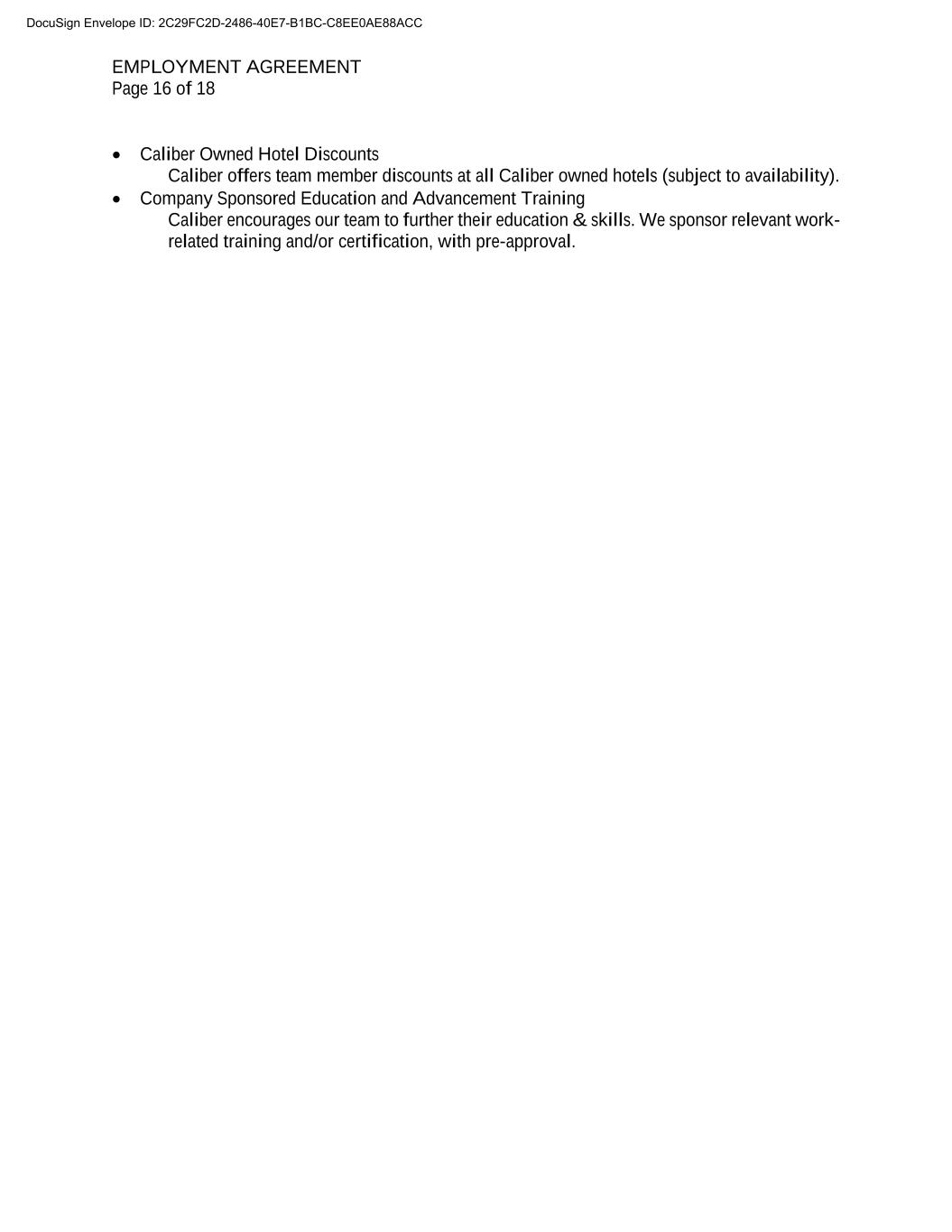EMPLOYMENT AGREEMENT Page 16 of 18  Caliber Owned Hotel Discounts Caliber offers team member discounts at all Caliber owned hotels (subject to availability).  Company Sponsored Education and Advancement Training Caliber encourages our team to further their education & skills. We sponsor relevant work- related training and/or certification, with pre-approval. DocuSign Envelope ID: 2C29FC2D-2486-40E7-B1BC-C8EE0AE88ACC