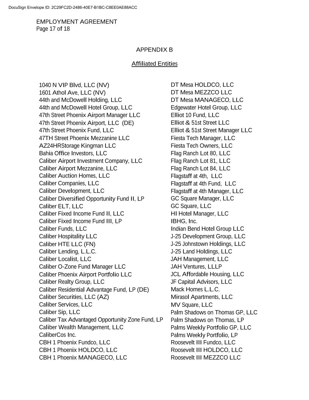 EMPLOYMENT AGREEMENT Page 17 of 18 APPENDIX B Affiliated Entities 1040 N VIP Blvd, LLC (NV) DT Mesa HOLDCO, LLC 1601 Athol Ave, LLC (NV) DT Mesa MEZZCO LLC 44th and McDowell Holding, LLC DT Mesa MANAGECO, LLC 44th and McDowell Hotel Group, LLC Edgewater Hotel Group, LLC 47th Street Phoenix Airport Manager LLC Elliot 10 Fund, LLC 47th Street Phoenix Airport, LLC (DE) Elliot & 51st Street LLC 47th Street Phoenix Fund, LLC Elliot & 51st Street Manager LLC 47TH Street Phoenix Mezzanine LLC Fiesta Tech Manager, LLC AZ24HRStorage Kingman LLC Fiesta Tech Owners, LLC Bahia Office Investors, LLC Flag Ranch Lot 80, LLC Caliber Airport Investment Company, LLC Flag Ranch Lot 81, LLC Caliber Airport Mezzanine, LLC Flag Ranch Lot 84, LLC Caliber Auction Homes, LLC Flagstaff at 4th, LLC Caliber Companies, LLC Flagstaff at 4th Fund, LLC Caliber Development, LLC Flagstaff at 4th Manager, LLC Caliber Diversified Opportunity Fund II, LP GC Square Manager, LLC Caliber ELT, LLC GC Square, LLC Caliber Fixed Income Fund II, LLC HI Hotel Manager, LLC Caliber Fixed Income Fund III, LP IBHG, Inc. Caliber Funds, LLC Indian Bend Hotel Group LLC Caliber Hospitality LLC J-25 Development Group, LLC Caliber HTE LLC (FN) J-25 Johnstown Holdings, LLC Caliber Lending, L.L.C. J-25 Land Holdings, LLC Caliber Localist, LLC JAH Management, LLC Caliber O-Zone Fund Manager LLC JAH Ventures, LLLP Caliber Phoenix Airport Portfolio LLC JCL Affordable Housing, LLC Caliber Realty Group, LLC JF Capital Advisors, LLC Caliber Residential Advantage Fund, LP (DE) Mack Homes L.L.C. Caliber Securities, LLC (AZ) Mirasol Apartments, LLC Caliber Services, LLC MV Square, LLC Caliber Sip, LLC Palm Shadows on Thomas GP, LLC Caliber Tax Advantaged Opportunity Zone Fund, LP Palm Shadows on Thomas, LP Caliber Wealth Management, LLC Palms Weekly Portfolio GP, LLC CaliberCos Inc. Palms Weekly Portfolio, LP CBH 1 Phoenix Fundco, LLC Roosevelt III Fundco, LLC CBH 1 Phoenix HOLDCO, LLC Roosevelt III HOLDCO, LLC CBH 1 Phoenix MANAGECO, LLC Roosevelt III MEZZCO LLC DocuSign Envelope ID: 2C29FC2D-2486-40E7-B1BC-C8EE0AE88ACC