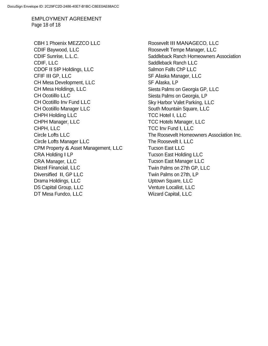 EMPLOYMENT AGREEMENT Page 18 of 18 CBH 1 Phoenix MEZZCO LLC Roosevelt III MANAGECO, LLC CDIF Baywood, LLC Roosevelt Tempe Manager, LLC CDIF Sunrise, L.L.C. Saddleback Ranch Homeowners Association CDIF, LLC Saddleback Ranch LLC CDOF II SIP Holdings, LLC Salmon Falls ChP LLC CFIF III GP, LLC SF Alaska Manager, LLC CH Mesa Development, LLC SF Alaska, LP CH Mesa Holdings, LLC Siesta Palms on Georgia GP, LLC CH Ocotillo LLC Siesta Palms on Georgia, LP CH Ocotillo Inv Fund LLC Sky Harbor Valet Parking, LLC CH Ocotillo Manager LLC South Mountain Square, LLC CHPH Holding LLC TCC Hotel I, LLC CHPH Manager, LLC TCC Hotels Manager, LLC CHPH, LLC TCC Inv Fund I, LLC Circle Lofts LLC The Roosevelt Homeowners Association Inc. Circle Lofts Manager LLC The Roosevelt I, LLC CPM Property & Asset Management, LLC Tucson East LLC CRA Holding I LP Tucson East Holding LLC CRA Manager, LLC Tucson East Manager LLC Diezel Financial, LLC Twin Palms on 27th GP, LLC Diversified II, GP LLC Twin Palms on 27th, LP Drama Holdings, LLC Uptown Square, LLC DS Capital Group, LLC Venture Localist, LLC DT Mesa Fundco, LLC Wizard Capital, LLC DocuSign Envelope ID: 2C29FC2D-2486-40E7-B1BC-C8EE0AE88ACC