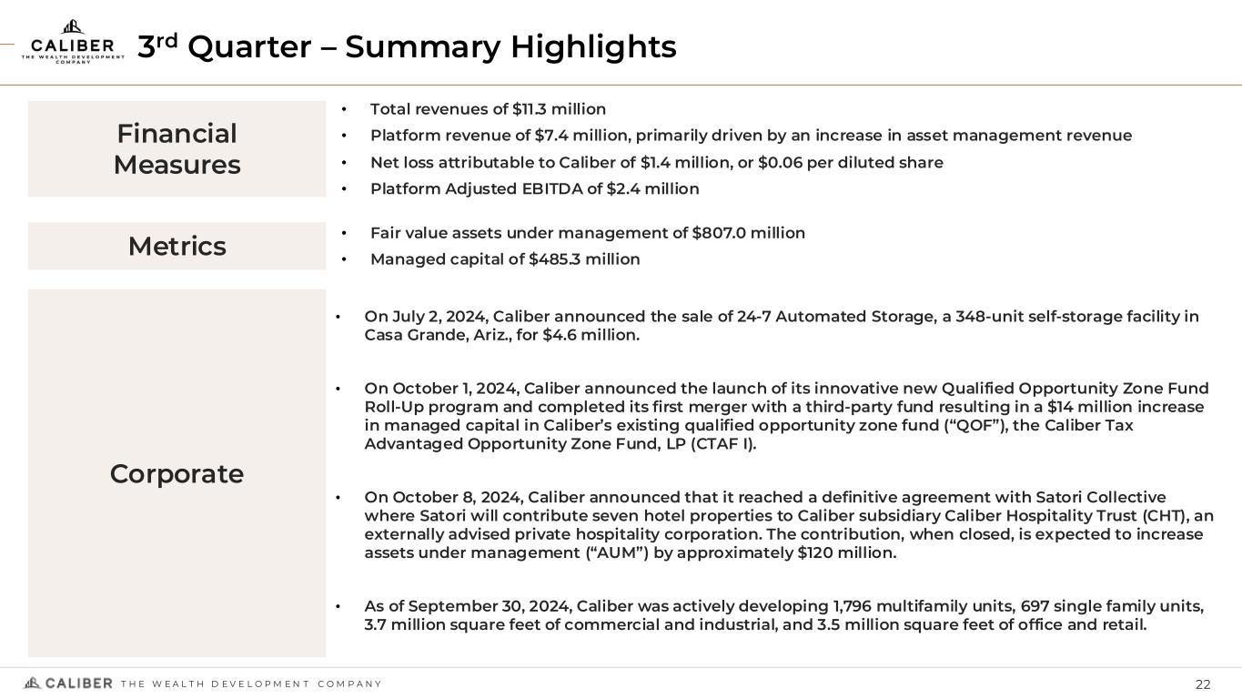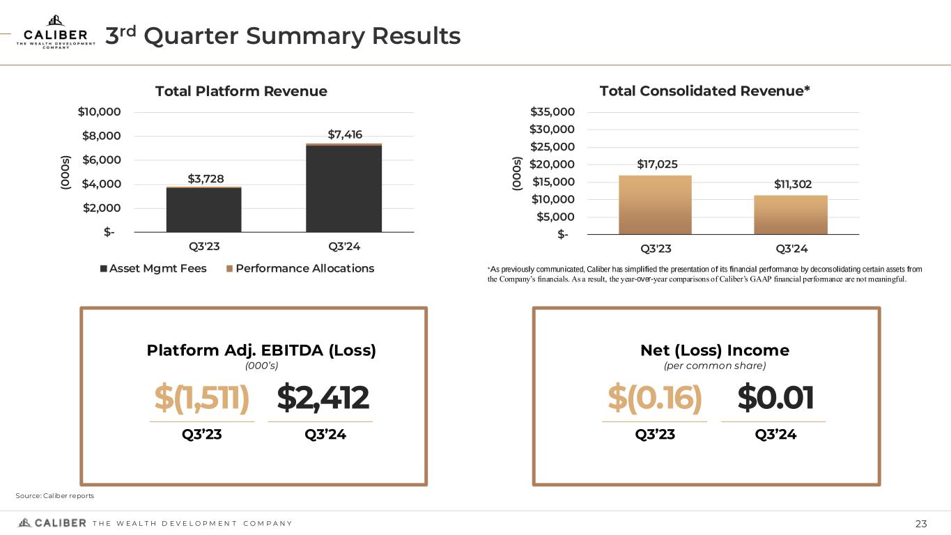 3rd Quarter – Summary Highlights 22T H E W E A L T H D E V E L O P M E N T C O M P A N Y Financial Measures Metrics Corporate • Fair value assets under management of $807.0 million • Managed capital of $485.3 million • Total revenues of $11.3 million • Platform revenue of $7.4 million, primarily driven by an increase in asset management revenue • Net loss attributable to Caliber of $1.4 million, or $0.06 per diluted share • Platform Adjusted EBITDA of $2.4 million • On July 2, 2024, Caliber announced the sale of 24-7 Automated Storage, a 348-unit self-storage facility in Casa Grande, Ariz., for $4.6 million. • On October 1, 2024, Caliber announced the launch of its innovative new Qualified Opportunity Zone Fund Roll-Up program and completed its first merger with a third-party fund resulting in a $14 million increase in managed capital in Caliber’s existing qualified opportunity zone fund (“QOF”), the Caliber Tax Advantaged Opportunity Zone Fund, LP (CTAF I). • On October 8, 2024, Caliber announced that it reached a definitive agreement with Satori Collective where Satori will contribute seven hotel properties to Caliber subsidiary Caliber Hospitality Trust (CHT), an externally advised private hospitality corporation. The contribution, when closed, is expected to increase assets under management (“AUM”) by approximately $120 million. • As of September 30, 2024, Caliber was actively developing 1,796 multifamily units, 697 single family units, 3.7 million square feet of commercial and industrial, and 3.5 million square feet of office and retail.