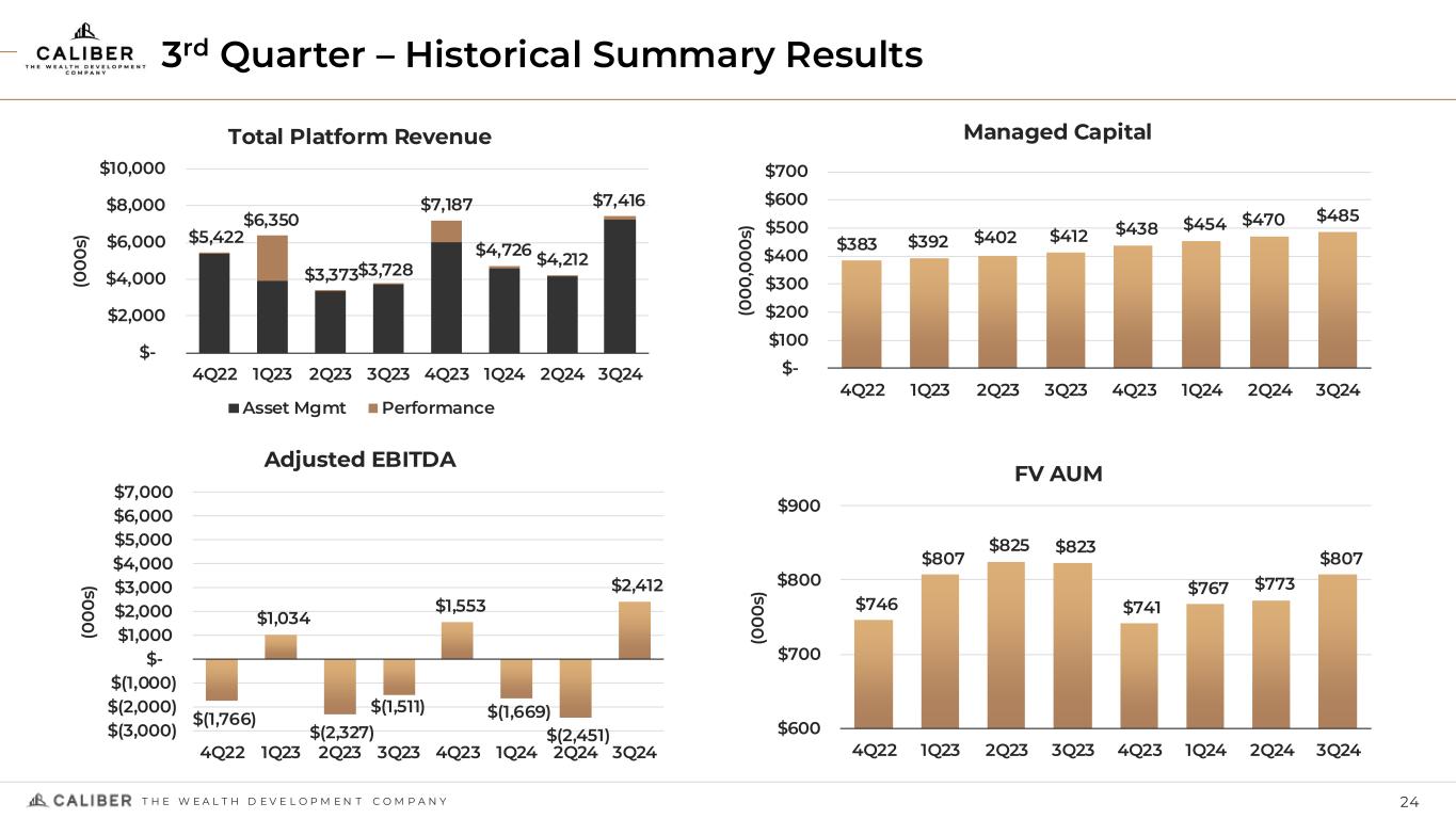 $17,025 $11,302 $- $5,000 $10,000 $15,000 $20,000 $25,000 $30,000 $35,000 Q3'23 Q3'24 (0 0 0 s) Total Consolidated Revenue* 3rd Quarter Summary Results 23T H E W E A L T H D E V E L O P M E N T C O M P A N Y Source: Caliber reports Net (Loss) Income (per common share) $(0.16) Q3’23 $0.01 Q3’24 $3,728 $7,416 $- $2,000 $4,000 $6,000 $8,000 $10,000 Q3'23 Q3'24 (0 0 0 s) Total Platform Revenue Asset Mgmt Fees Performance Allocations Platform Adj. EBITDA (Loss) (000’s) $(1,511) Q3’23 $2,412 Q3’24 *As previously communicated, Caliber has simplified the presentation of its financial performance by deconsolidating certain assets from the Company’s financials. As a result, the year-over-year comparisons of Caliber’s GAAP financial performance are not meaningful.