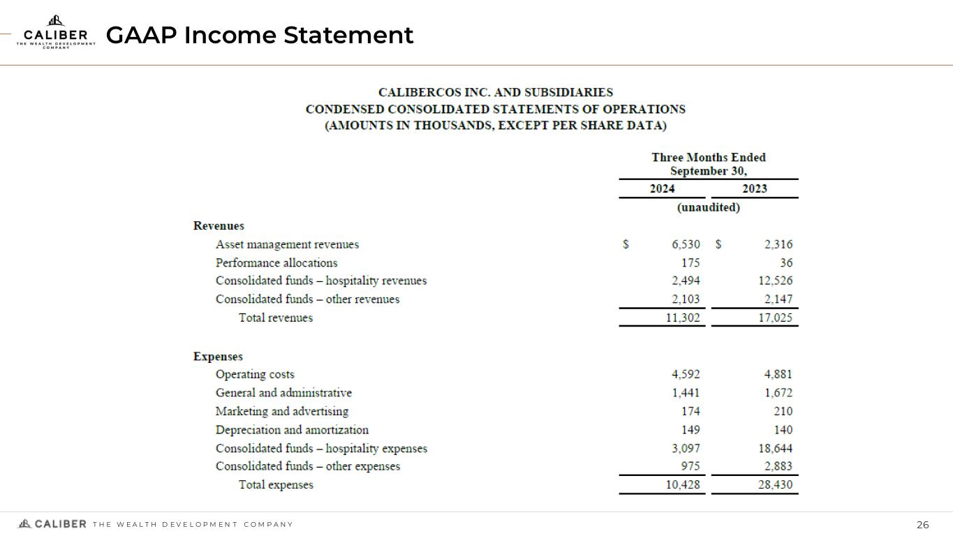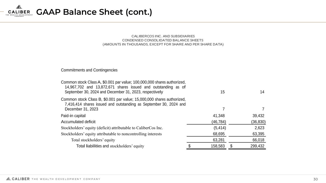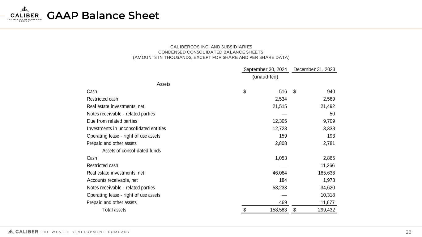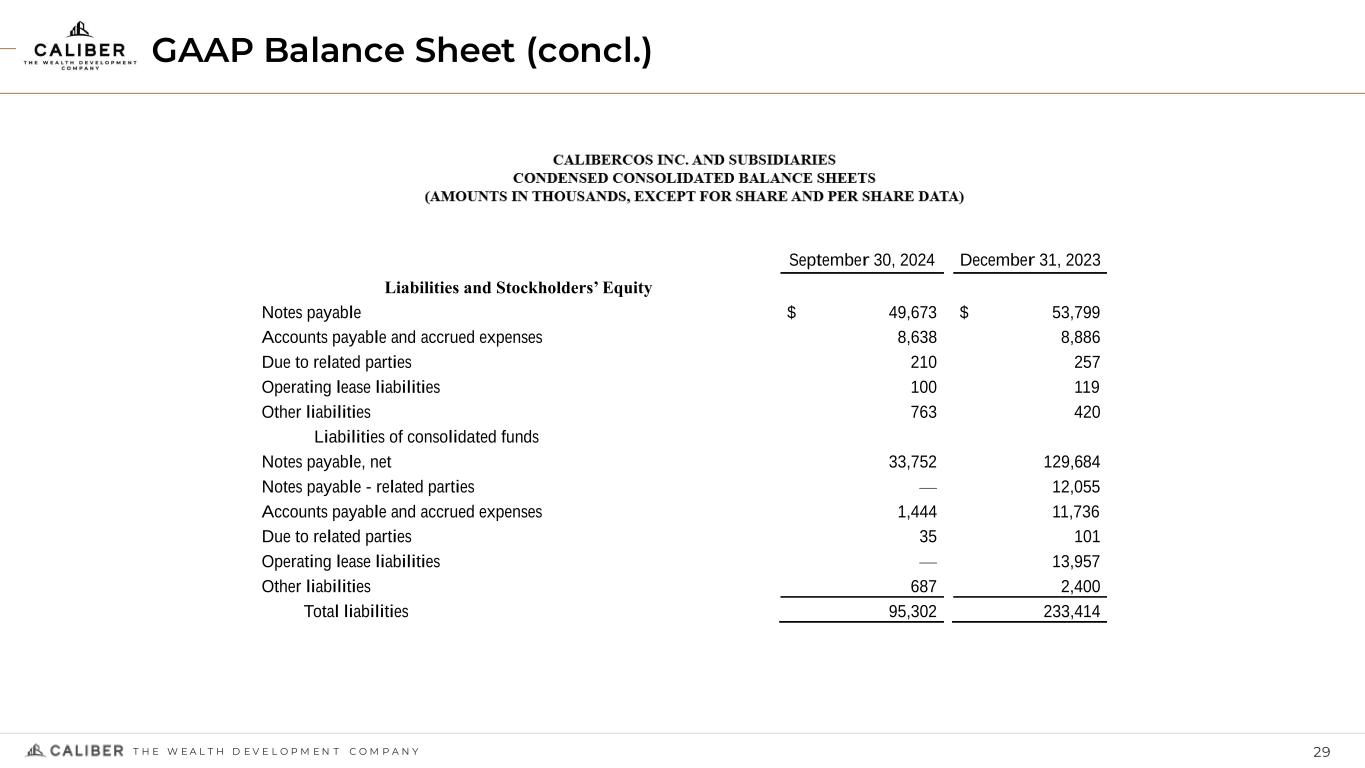 GAAP Balance Sheet 28T H E W E A L T H D E V E L O P M E N T C O M P A N Y CALIBERCOS INC. AND SUBSIDIARIES CONDENSED CONSOLIDATED BALANCE SHEETS (AMOUNTS IN THOUSANDS, EXCEPT FOR SHARE AND PER SHARE DATA) September 30, 2024 December 31, 2023 (unaudited) Assets Cash $ 516 $ 940 Restricted cash 2,534 2,569 Real estate investments, net 21,515 21,492 Notes receivable - related parties — 50 Due from related parties 12,305 9,709 Investments in unconsolidated entities 12,723 3,338 Operating lease - right of use assets 159 193 Prepaid and other assets 2,808 2,781 Assets of consolidated funds Cash 1,053 2,865 Restricted cash — 11,266 Real estate investments, net 46,084 185,636 Accounts receivable, net 184 1,978 Notes receivable - related parties 58,233 34,620 Operating lease - right of use assets — 10,318 Prepaid and other assets 469 11,677 Total assets $ 158,583 $ 299,432