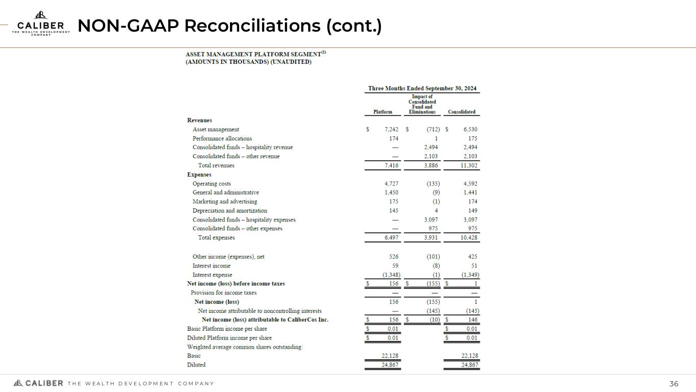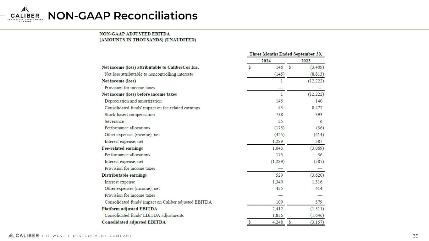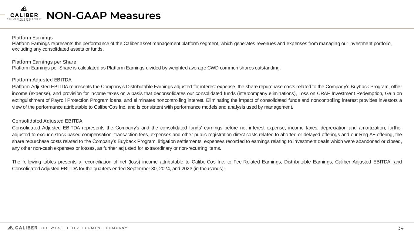 34T H E W E A L T H D E V E L O P M E N T C O M P A N Y Platform Earnings Platform Earnings represents the performance of the Caliber asset management platform segment, which generates revenues and expenses from managing our investment portfolio, excluding any consolidated assets or funds. Platform Earnings per Share Platform Earnings per Share is calculated as Platform Earnings divided by weighted average CWD common shares outstanding. Platform Adjusted EBITDA Platform Adjusted EBITDA represents the Company’s Distributable Earnings adjusted for interest expense, the share repurchase costs related to the Company’s Buyback Program, other income (expense), and provision for income taxes on a basis that deconsolidates our consolidated funds (intercompany eliminations), Loss on CRAF Investment Redemption, Gain on extinguishment of Payroll Protection Program loans, and eliminates noncontrolling interest. Eliminating the impact of consolidated funds and noncontrolling interest provides investors a view of the performance attributable to CaliberCos Inc. and is consistent with performance models and analysis used by management. Consolidated Adjusted EBITDA Consolidated Adjusted EBITDA represents the Company’s and the consolidated funds’ earnings before net interest expense, income taxes, depreciation and amortization, further adjusted to exclude stock-based compensation, transaction fees, expenses and other public registration direct costs related to aborted or delayed offerings and our Reg A+ offering, the share repurchase costs related to the Company’s Buyback Program, litigation settlements, expenses recorded to earnings relating to investment deals which were abandoned or closed, any other non-cash expenses or losses, as further adjusted for extraordinary or non-recurring items. The following tables presents a reconciliation of net (loss) income attributable to CaliberCos Inc. to Fee-Related Earnings, Distributable Earnings, Caliber Adjusted EBITDA, and Consolidated Adjusted EBITDA for the quarters ended September 30, 2024, and 2023 (in thousands): NON-GAAP Measures