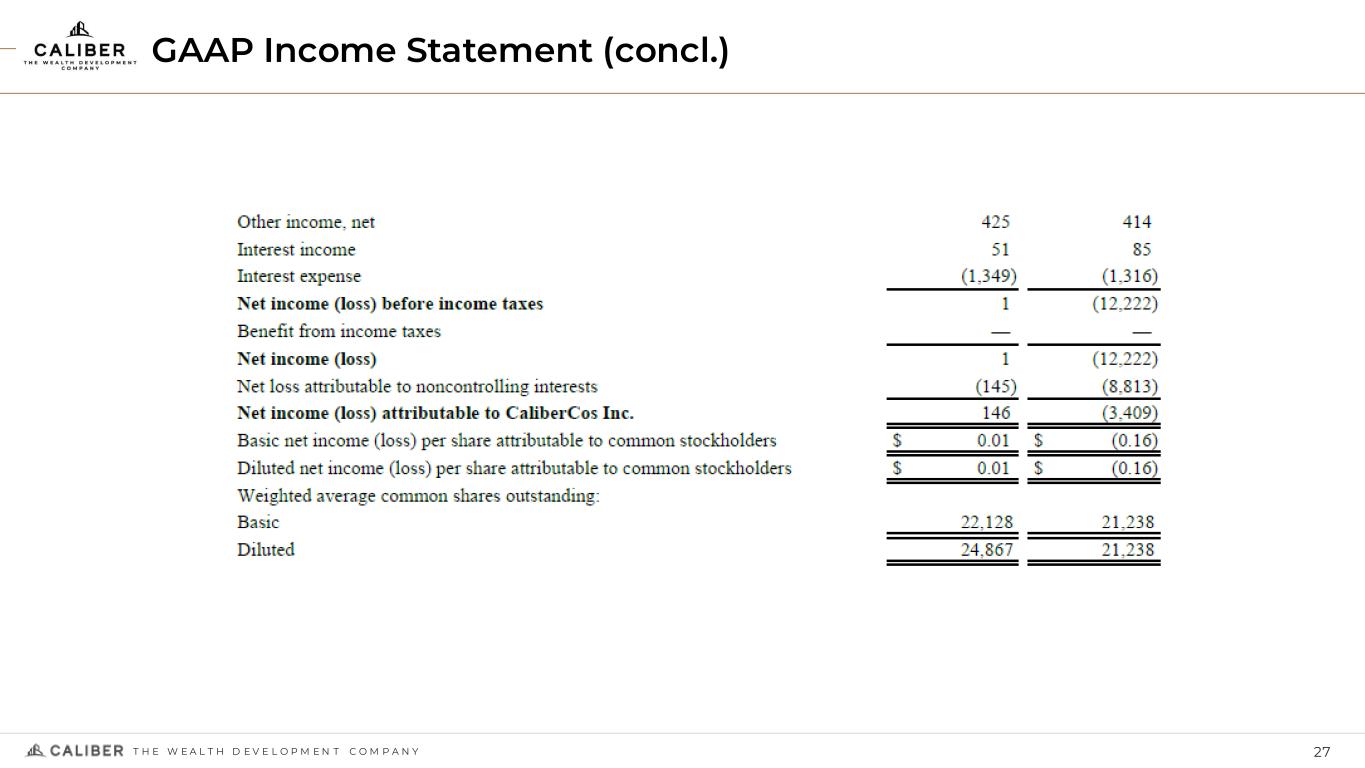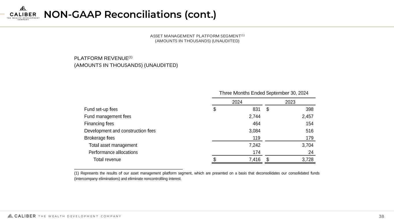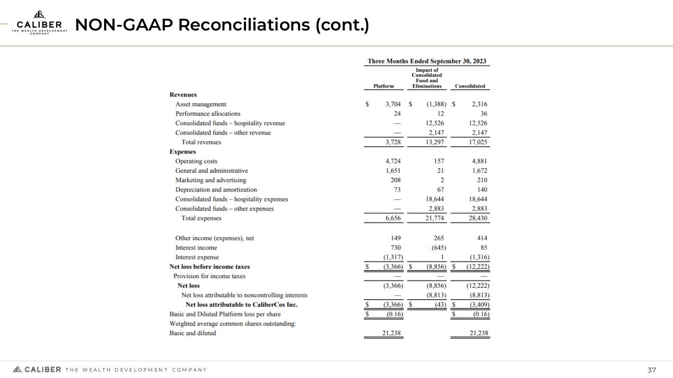 34T H E W E A L T H D E V E L O P M E N T C O M P A N Y Platform Earnings Platform Earnings represents the performance of the Caliber asset management platform segment, which generates revenues and expenses from managing our investment portfolio, excluding any consolidated assets or funds. Platform Earnings per Share Platform Earnings per Share is calculated as Platform Earnings divided by weighted average CWD common shares outstanding. Platform Adjusted EBITDA Platform Adjusted EBITDA represents the Company’s Distributable Earnings adjusted for interest expense, the share repurchase costs related to the Company’s Buyback Program, other income (expense), and provision for income taxes on a basis that deconsolidates our consolidated funds (intercompany eliminations), Loss on CRAF Investment Redemption, Gain on extinguishment of Payroll Protection Program loans, and eliminates noncontrolling interest. Eliminating the impact of consolidated funds and noncontrolling interest provides investors a view of the performance attributable to CaliberCos Inc. and is consistent with performance models and analysis used by management. Consolidated Adjusted EBITDA Consolidated Adjusted EBITDA represents the Company’s and the consolidated funds’ earnings before net interest expense, income taxes, depreciation and amortization, further adjusted to exclude stock-based compensation, transaction fees, expenses and other public registration direct costs related to aborted or delayed offerings and our Reg A+ offering, the share repurchase costs related to the Company’s Buyback Program, litigation settlements, expenses recorded to earnings relating to investment deals which were abandoned or closed, any other non-cash expenses or losses, as further adjusted for extraordinary or non-recurring items. The following tables presents a reconciliation of net (loss) income attributable to CaliberCos Inc. to Fee-Related Earnings, Distributable Earnings, Caliber Adjusted EBITDA, and Consolidated Adjusted EBITDA for the quarters ended September 30, 2024, and 2023 (in thousands): NON-GAAP Measures