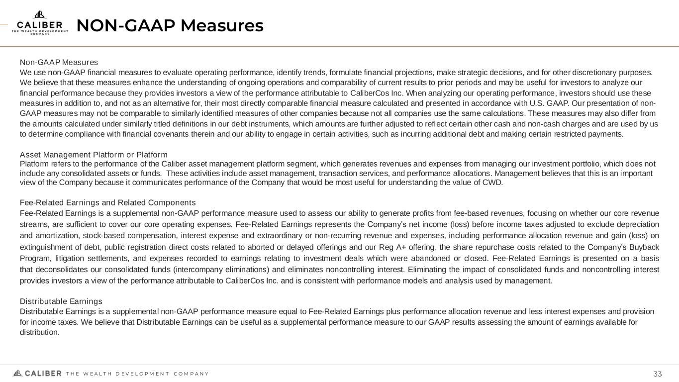 33T H E W E A L T H D E V E L O P M E N T C O M P A N Y Non-GAAP Measures We use non-GAAP financial measures to evaluate operating performance, identify trends, formulate financial projections, make strategic decisions, and for other discretionary purposes. We believe that these measures enhance the understanding of ongoing operations and comparability of current results to prior periods and may be useful for investors to analyze our financial performance because they provides investors a view of the performance attributable to CaliberCos Inc. When analyzing our operating performance, investors should use these measures in addition to, and not as an alternative for, their most directly comparable financial measure calculated and presented in accordance with U.S. GAAP. Our presentation of non- GAAP measures may not be comparable to similarly identified measures of other companies because not all companies use the same calculations. These measures may also differ from the amounts calculated under similarly titled definitions in our debt instruments, which amounts are further adjusted to reflect certain other cash and non-cash charges and are used by us to determine compliance with financial covenants therein and our ability to engage in certain activities, such as incurring additional debt and making certain restricted payments. Asset Management Platform or Platform Platform refers to the performance of the Caliber asset management platform segment, which generates revenues and expenses from managing our investment portfolio, which does not include any consolidated assets or funds. These activities include asset management, transaction services, and performance allocations. Management believes that this is an important view of the Company because it communicates performance of the Company that would be most useful for understanding the value of CWD. Fee-Related Earnings and Related Components Fee-Related Earnings is a supplemental non-GAAP performance measure used to assess our ability to generate profits from fee-based revenues, focusing on whether our core revenue streams, are sufficient to cover our core operating expenses. Fee-Related Earnings represents the Company’s net income (loss) before income taxes adjusted to exclude depreciation and amortization, stock-based compensation, interest expense and extraordinary or non-recurring revenue and expenses, including performance allocation revenue and gain (loss) on extinguishment of debt, public registration direct costs related to aborted or delayed offerings and our Reg A+ offering, the share repurchase costs related to the Company’s Buyback Program, litigation settlements, and expenses recorded to earnings relating to investment deals which were abandoned or closed. Fee-Related Earnings is presented on a basis that deconsolidates our consolidated funds (intercompany eliminations) and eliminates noncontrolling interest. Eliminating the impact of consolidated funds and noncontrolling interest provides investors a view of the performance attributable to CaliberCos Inc. and is consistent with performance models and analysis used by management. Distributable Earnings Distributable Earnings is a supplemental non-GAAP performance measure equal to Fee-Related Earnings plus performance allocation revenue and less interest expenses and provision for income taxes. We believe that Distributable Earnings can be useful as a supplemental performance measure to our GAAP results assessing the amount of earnings available for distribution. NON-GAAP Measures
