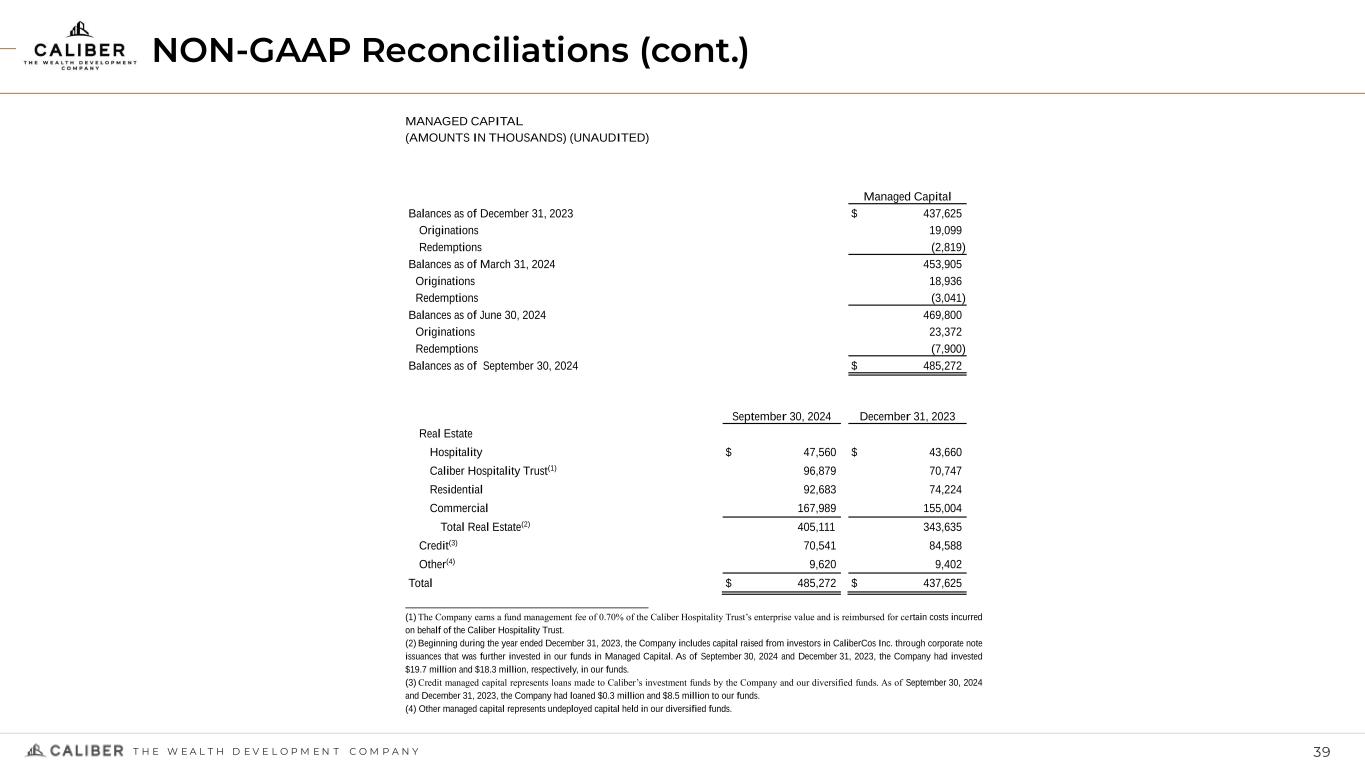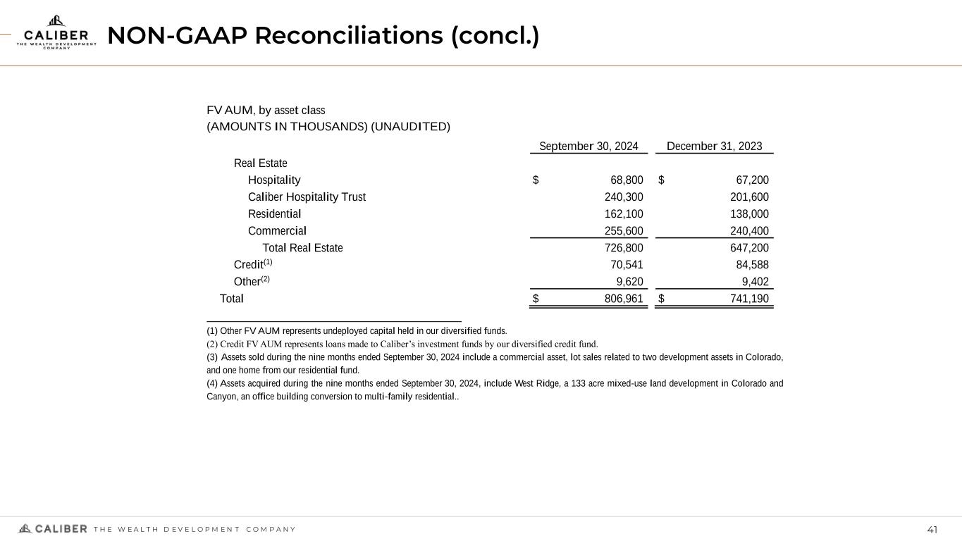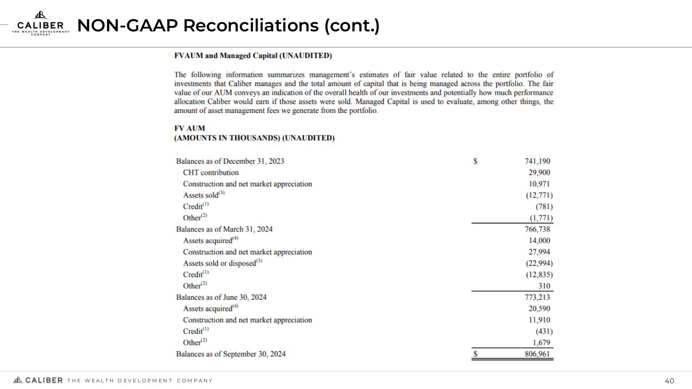 NON-GAAP Reconciliations (cont.) 39T H E W E A L T H D E V E L O P M E N T C O M P A N Y MANAGED CAPITAL (AMOUNTS IN THOUSANDS) (UNAUDITED) Managed Capital Balances as of December 31, 2023 $ 437,625 Originations 19,099 Redemptions (2,819) Balances as of March 31, 2024 453,905 Originations 18,936 Redemptions (3,041) Balances as of June 30, 2024 469,800 Originations 23,372 Redemptions (7,900) Balances as of September 30, 2024 $ 485,272 September 30, 2024 December 31, 2023 Real Estate Hospitality $ 47,560 $ 43,660 Caliber Hospitality Trust(1) 96,879 70,747 Residential 92,683 74,224 Commercial 167,989 155,004 Total Real Estate(2) 405,111 343,635 Credit(3) 70,541 84,588 Other(4) 9,620 9,402 Total $ 485,272 $ 437,625 _________________________________________ (1) The Company earns a fund management fee of 0.70% of the Caliber Hospitality Trust’s enterprise value and is reimbursed for certain costs incurred on behalf of the Caliber Hospitality Trust. (2) Beginning during the year ended December 31, 2023, the Company includes capital raised from investors in CaliberCos Inc. through corporate note issuances that was further invested in our funds in Managed Capital. As of September 30, 2024 and December 31, 2023, the Company had invested $19.7 million and $18.3 million, respectively, in our funds. (3) Credit managed capital represents loans made to Caliber’s investment funds by the Company and our diversified funds. As of September 30, 2024 and December 31, 2023, the Company had loaned $0.3 million and $8.5 million to our funds. (4) Other managed capital represents undeployed capital held in our diversified funds.