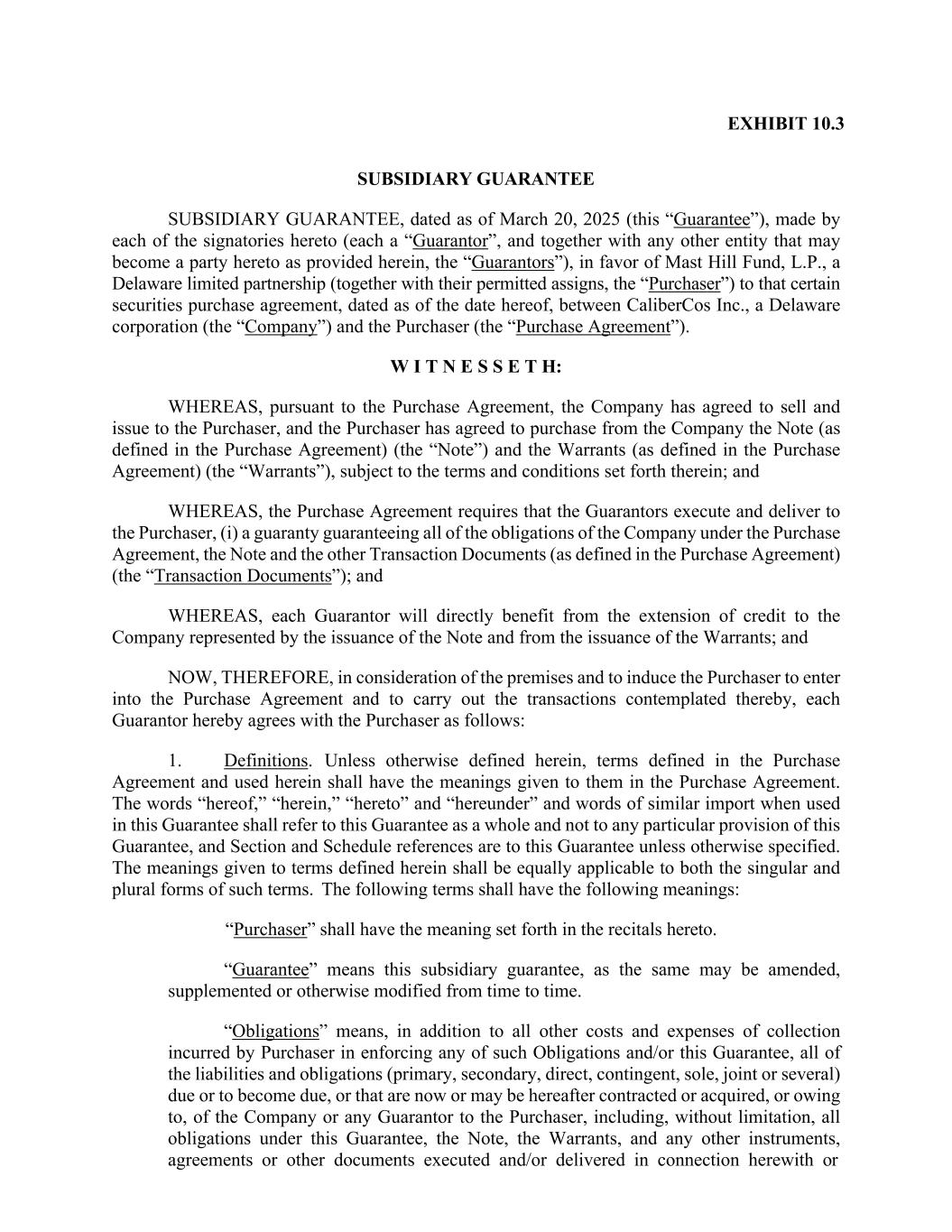 EXHIBIT 10.3 SUBSIDIARY GUARANTEE SUBSIDIARY GUARANTEE, dated as of March 20, 2025 (this “Guarantee”), made by each of the signatories hereto (each a “Guarantor”, and together with any other entity that may become a party hereto as provided herein, the “Guarantors”), in favor of Mast Hill Fund, L.P., a Delaware limited partnership (together with their permitted assigns, the “Purchaser”) to that certain securities purchase agreement, dated as of the date hereof, between CaliberCos Inc., a Delaware corporation (the “Company”) and the Purchaser (the “Purchase Agreement”). W I T N E S S E T H: WHEREAS, pursuant to the Purchase Agreement, the Company has agreed to sell and issue to the Purchaser, and the Purchaser has agreed to purchase from the Company the Note (as defined in the Purchase Agreement) (the “Note”) and the Warrants (as defined in the Purchase Agreement) (the “Warrants”), subject to the terms and conditions set forth therein; and WHEREAS, the Purchase Agreement requires that the Guarantors execute and deliver to the Purchaser, (i) a guaranty guaranteeing all of the obligations of the Company under the Purchase Agreement, the Note and the other Transaction Documents (as defined in the Purchase Agreement) (the “Transaction Documents”); and WHEREAS, each Guarantor will directly benefit from the extension of credit to the Company represented by the issuance of the Note and from the issuance of the Warrants; and NOW, THEREFORE, in consideration of the premises and to induce the Purchaser to enter into the Purchase Agreement and to carry out the transactions contemplated thereby, each Guarantor hereby agrees with the Purchaser as follows: 1. Definitions. Unless otherwise defined herein, terms defined in the Purchase Agreement and used herein shall have the meanings given to them in the Purchase Agreement. The words “hereof,” “herein,” “hereto” and “hereunder” and words of similar import when used in this Guarantee shall refer to this Guarantee as a whole and not to any particular provision of this Guarantee, and Section and Schedule references are to this Guarantee unless otherwise specified. The meanings given to terms defined herein shall be equally applicable to both the singular and plural forms of such terms. The following terms shall have the following meanings: “Purchaser” shall have the meaning set forth in the recitals hereto. “Guarantee” means this subsidiary guarantee, as the same may be amended, supplemented or otherwise modified from time to time. “Obligations” means, in addition to all other costs and expenses of collection incurred by Purchaser in enforcing any of such Obligations and/or this Guarantee, all of the liabilities and obligations (primary, secondary, direct, contingent, sole, joint or several) due or to become due, or that are now or may be hereafter contracted or acquired, or owing to, of the Company or any Guarantor to the Purchaser, including, without limitation, all obligations under this Guarantee, the Note, the Warrants, and any other instruments, agreements or other documents executed and/or delivered in connection herewith or