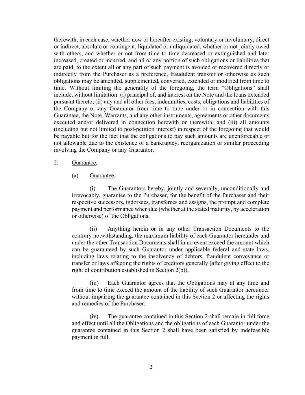 2 therewith, in each case, whether now or hereafter existing, voluntary or involuntary, direct or indirect, absolute or contingent, liquidated or unliquidated, whether or not jointly owed with others, and whether or not from time to time decreased or extinguished and later increased, created or incurred, and all or any portion of such obligations or liabilities that are paid, to the extent all or any part of such payment is avoided or recovered directly or indirectly from the Purchaser as a preference, fraudulent transfer or otherwise as such obligations may be amended, supplemented, converted, extended or modified from time to time. Without limiting the generality of the foregoing, the term “Obligations” shall include, without limitation: (i) principal of, and interest on the Note and the loans extended pursuant thereto; (ii) any and all other fees, indemnities, costs, obligations and liabilities of the Company or any Guarantor from time to time under or in connection with this Guarantee, the Note, Warrants, and any other instruments, agreements or other documents executed and/or delivered in connection herewith or therewith; and (iii) all amounts (including but not limited to post-petition interest) in respect of the foregoing that would be payable but for the fact that the obligations to pay such amounts are unenforceable or not allowable due to the existence of a bankruptcy, reorganization or similar proceeding involving the Company or any Guarantor. 2. Guarantee. (a) Guarantee. (i) The Guarantors hereby, jointly and severally, unconditionally and irrevocably, guarantee to the Purchaser, for the benefit of the Purchaser and their respective successors, indorsees, transferees and assigns, the prompt and complete payment and performance when due (whether at the stated maturity, by acceleration or otherwise) of the Obligations. (ii) Anything herein or in any other Transaction Documents to the contrary notwithstanding, the maximum liability of each Guarantor hereunder and under the other Transaction Documents shall in no event exceed the amount which can be guaranteed by such Guarantor under applicable federal and state laws, including laws relating to the insolvency of debtors, fraudulent conveyance or transfer or laws affecting the rights of creditors generally (after giving effect to the right of contribution established in Section 2(b)). (iii) Each Guarantor agrees that the Obligations may at any time and from time to time exceed the amount of the liability of such Guarantor hereunder without impairing the guarantee contained in this Section 2 or affecting the rights and remedies of the Purchaser. (iv) The guarantee contained in this Section 2 shall remain in full force and effect until all the Obligations and the obligations of each Guarantor under the guarantee contained in this Section 2 shall have been satisfied by indefeasible payment in full.