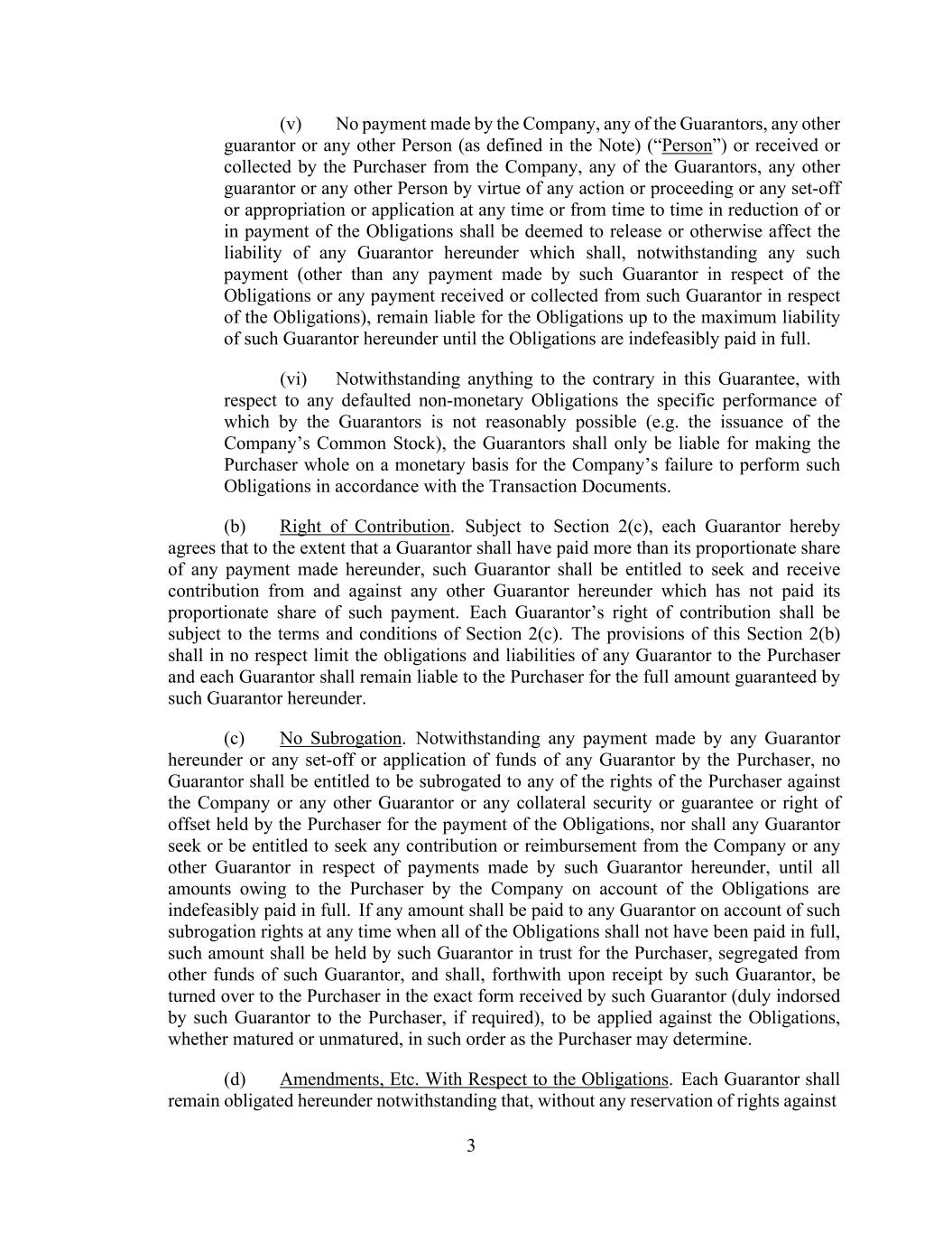 3 (v) No payment made by the Company, any of the Guarantors, any other guarantor or any other Person (as defined in the Note) (“Person”) or received or collected by the Purchaser from the Company, any of the Guarantors, any other guarantor or any other Person by virtue of any action or proceeding or any set-off or appropriation or application at any time or from time to time in reduction of or in payment of the Obligations shall be deemed to release or otherwise affect the liability of any Guarantor hereunder which shall, notwithstanding any such payment (other than any payment made by such Guarantor in respect of the Obligations or any payment received or collected from such Guarantor in respect of the Obligations), remain liable for the Obligations up to the maximum liability of such Guarantor hereunder until the Obligations are indefeasibly paid in full. (vi) Notwithstanding anything to the contrary in this Guarantee, with respect to any defaulted non-monetary Obligations the specific performance of which by the Guarantors is not reasonably possible (e.g. the issuance of the Company’s Common Stock), the Guarantors shall only be liable for making the Purchaser whole on a monetary basis for the Company’s failure to perform such Obligations in accordance with the Transaction Documents. (b) Right of Contribution. Subject to Section 2(c), each Guarantor hereby agrees that to the extent that a Guarantor shall have paid more than its proportionate share of any payment made hereunder, such Guarantor shall be entitled to seek and receive contribution from and against any other Guarantor hereunder which has not paid its proportionate share of such payment. Each Guarantor’s right of contribution shall be subject to the terms and conditions of Section 2(c). The provisions of this Section 2(b) shall in no respect limit the obligations and liabilities of any Guarantor to the Purchaser and each Guarantor shall remain liable to the Purchaser for the full amount guaranteed by such Guarantor hereunder. (c) No Subrogation. Notwithstanding any payment made by any Guarantor hereunder or any set-off or application of funds of any Guarantor by the Purchaser, no Guarantor shall be entitled to be subrogated to any of the rights of the Purchaser against the Company or any other Guarantor or any collateral security or guarantee or right of offset held by the Purchaser for the payment of the Obligations, nor shall any Guarantor seek or be entitled to seek any contribution or reimbursement from the Company or any other Guarantor in respect of payments made by such Guarantor hereunder, until all amounts owing to the Purchaser by the Company on account of the Obligations are indefeasibly paid in full. If any amount shall be paid to any Guarantor on account of such subrogation rights at any time when all of the Obligations shall not have been paid in full, such amount shall be held by such Guarantor in trust for the Purchaser, segregated from other funds of such Guarantor, and shall, forthwith upon receipt by such Guarantor, be turned over to the Purchaser in the exact form received by such Guarantor (duly indorsed by such Guarantor to the Purchaser, if required), to be applied against the Obligations, whether matured or unmatured, in such order as the Purchaser may determine. (d) Amendments, Etc. With Respect to the Obligations. Each Guarantor shall remain obligated hereunder notwithstanding that, without any reservation of rights against