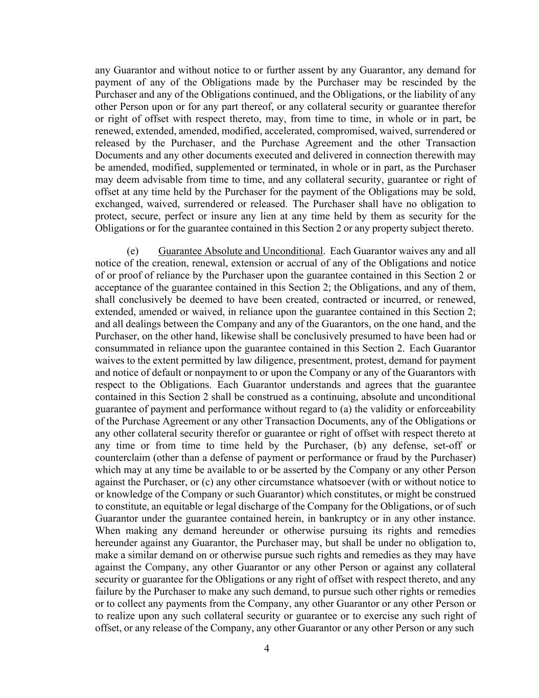 4 any Guarantor and without notice to or further assent by any Guarantor, any demand for payment of any of the Obligations made by the Purchaser may be rescinded by the Purchaser and any of the Obligations continued, and the Obligations, or the liability of any other Person upon or for any part thereof, or any collateral security or guarantee therefor or right of offset with respect thereto, may, from time to time, in whole or in part, be renewed, extended, amended, modified, accelerated, compromised, waived, surrendered or released by the Purchaser, and the Purchase Agreement and the other Transaction Documents and any other documents executed and delivered in connection therewith may be amended, modified, supplemented or terminated, in whole or in part, as the Purchaser may deem advisable from time to time, and any collateral security, guarantee or right of offset at any time held by the Purchaser for the payment of the Obligations may be sold, exchanged, waived, surrendered or released. The Purchaser shall have no obligation to protect, secure, perfect or insure any lien at any time held by them as security for the Obligations or for the guarantee contained in this Section 2 or any property subject thereto. (e) Guarantee Absolute and Unconditional. Each Guarantor waives any and all notice of the creation, renewal, extension or accrual of any of the Obligations and notice of or proof of reliance by the Purchaser upon the guarantee contained in this Section 2 or acceptance of the guarantee contained in this Section 2; the Obligations, and any of them, shall conclusively be deemed to have been created, contracted or incurred, or renewed, extended, amended or waived, in reliance upon the guarantee contained in this Section 2; and all dealings between the Company and any of the Guarantors, on the one hand, and the Purchaser, on the other hand, likewise shall be conclusively presumed to have been had or consummated in reliance upon the guarantee contained in this Section 2. Each Guarantor waives to the extent permitted by law diligence, presentment, protest, demand for payment and notice of default or nonpayment to or upon the Company or any of the Guarantors with respect to the Obligations. Each Guarantor understands and agrees that the guarantee contained in this Section 2 shall be construed as a continuing, absolute and unconditional guarantee of payment and performance without regard to (a) the validity or enforceability of the Purchase Agreement or any other Transaction Documents, any of the Obligations or any other collateral security therefor or guarantee or right of offset with respect thereto at any time or from time to time held by the Purchaser, (b) any defense, set-off or counterclaim (other than a defense of payment or performance or fraud by the Purchaser) which may at any time be available to or be asserted by the Company or any other Person against the Purchaser, or (c) any other circumstance whatsoever (with or without notice to or knowledge of the Company or such Guarantor) which constitutes, or might be construed to constitute, an equitable or legal discharge of the Company for the Obligations, or of such Guarantor under the guarantee contained herein, in bankruptcy or in any other instance. When making any demand hereunder or otherwise pursuing its rights and remedies hereunder against any Guarantor, the Purchaser may, but shall be under no obligation to, make a similar demand on or otherwise pursue such rights and remedies as they may have against the Company, any other Guarantor or any other Person or against any collateral security or guarantee for the Obligations or any right of offset with respect thereto, and any failure by the Purchaser to make any such demand, to pursue such other rights or remedies or to collect any payments from the Company, any other Guarantor or any other Person or to realize upon any such collateral security or guarantee or to exercise any such right of offset, or any release of the Company, any other Guarantor or any other Person or any such