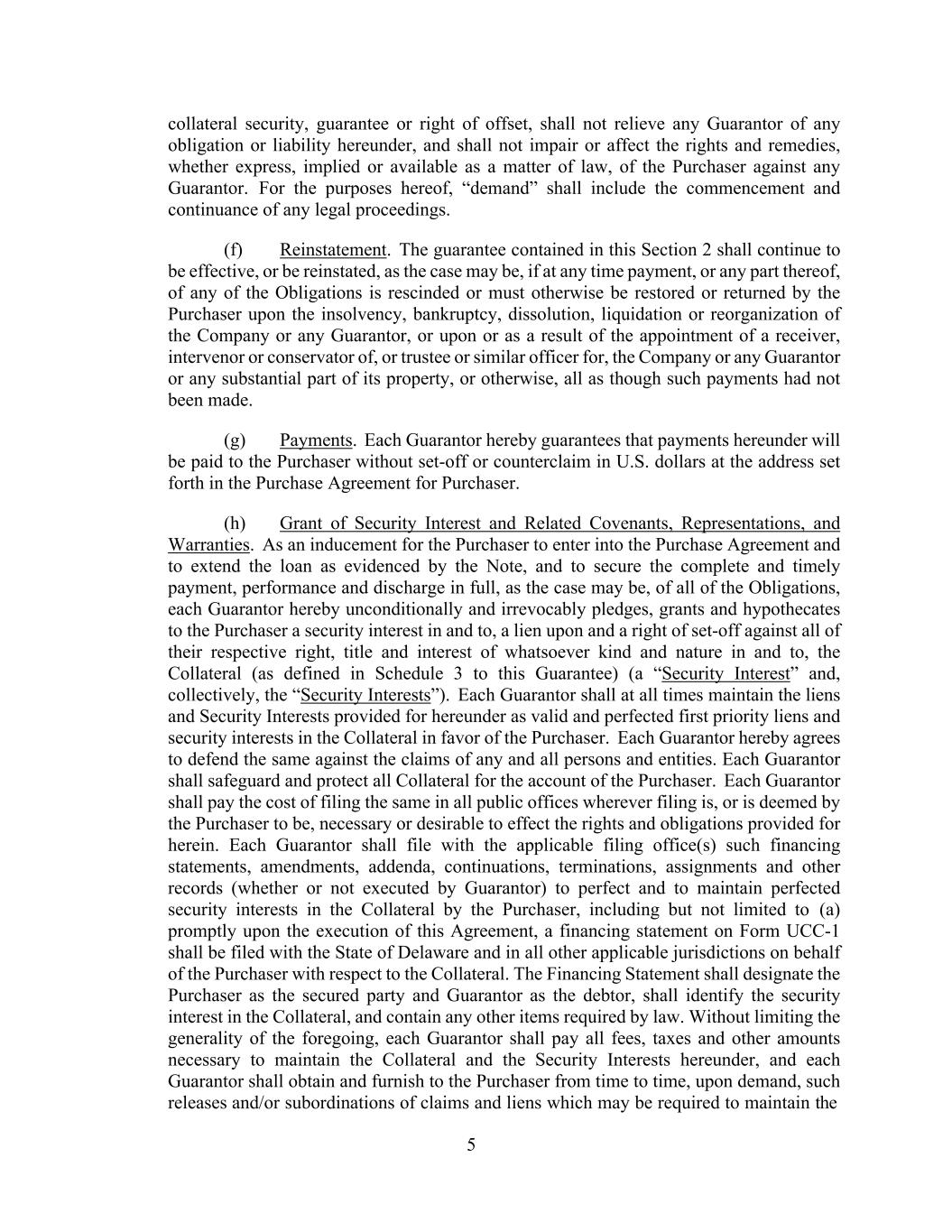 5 collateral security, guarantee or right of offset, shall not relieve any Guarantor of any obligation or liability hereunder, and shall not impair or affect the rights and remedies, whether express, implied or available as a matter of law, of the Purchaser against any Guarantor. For the purposes hereof, “demand” shall include the commencement and continuance of any legal proceedings. (f) Reinstatement. The guarantee contained in this Section 2 shall continue to be effective, or be reinstated, as the case may be, if at any time payment, or any part thereof, of any of the Obligations is rescinded or must otherwise be restored or returned by the Purchaser upon the insolvency, bankruptcy, dissolution, liquidation or reorganization of the Company or any Guarantor, or upon or as a result of the appointment of a receiver, intervenor or conservator of, or trustee or similar officer for, the Company or any Guarantor or any substantial part of its property, or otherwise, all as though such payments had not been made. (g) Payments. Each Guarantor hereby guarantees that payments hereunder will be paid to the Purchaser without set-off or counterclaim in U.S. dollars at the address set forth in the Purchase Agreement for Purchaser. (h) Grant of Security Interest and Related Covenants, Representations, and Warranties. As an inducement for the Purchaser to enter into the Purchase Agreement and to extend the loan as evidenced by the Note, and to secure the complete and timely payment, performance and discharge in full, as the case may be, of all of the Obligations, each Guarantor hereby unconditionally and irrevocably pledges, grants and hypothecates to the Purchaser a security interest in and to, a lien upon and a right of set-off against all of their respective right, title and interest of whatsoever kind and nature in and to, the Collateral (as defined in Schedule 3 to this Guarantee) (a “Security Interest” and, collectively, the “Security Interests”). Each Guarantor shall at all times maintain the liens and Security Interests provided for hereunder as valid and perfected first priority liens and security interests in the Collateral in favor of the Purchaser. Each Guarantor hereby agrees to defend the same against the claims of any and all persons and entities. Each Guarantor shall safeguard and protect all Collateral for the account of the Purchaser. Each Guarantor shall pay the cost of filing the same in all public offices wherever filing is, or is deemed by the Purchaser to be, necessary or desirable to effect the rights and obligations provided for herein. Each Guarantor shall file with the applicable filing office(s) such financing statements, amendments, addenda, continuations, terminations, assignments and other records (whether or not executed by Guarantor) to perfect and to maintain perfected security interests in the Collateral by the Purchaser, including but not limited to (a) promptly upon the execution of this Agreement, a financing statement on Form UCC-1 shall be filed with the State of Delaware and in all other applicable jurisdictions on behalf of the Purchaser with respect to the Collateral. The Financing Statement shall designate the Purchaser as the secured party and Guarantor as the debtor, shall identify the security interest in the Collateral, and contain any other items required by law. Without limiting the generality of the foregoing, each Guarantor shall pay all fees, taxes and other amounts necessary to maintain the Collateral and the Security Interests hereunder, and each Guarantor shall obtain and furnish to the Purchaser from time to time, upon demand, such releases and/or subordinations of claims and liens which may be required to maintain the