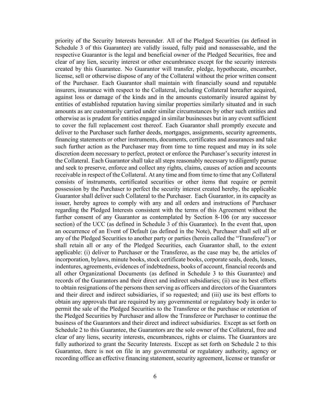 6 priority of the Security Interests hereunder. All of the Pledged Securities (as defined in Schedule 3 of this Guarantee) are validly issued, fully paid and nonassessable, and the respective Guarantor is the legal and beneficial owner of the Pledged Securities, free and clear of any lien, security interest or other encumbrance except for the security interests created by this Guarantee. No Guarantor will transfer, pledge, hypothecate, encumber, license, sell or otherwise dispose of any of the Collateral without the prior written consent of the Purchaser. Each Guarantor shall maintain with financially sound and reputable insurers, insurance with respect to the Collateral, including Collateral hereafter acquired, against loss or damage of the kinds and in the amounts customarily insured against by entities of established reputation having similar properties similarly situated and in such amounts as are customarily carried under similar circumstances by other such entities and otherwise as is prudent for entities engaged in similar businesses but in any event sufficient to cover the full replacement cost thereof. Each Guarantor shall promptly execute and deliver to the Purchaser such further deeds, mortgages, assignments, security agreements, financing statements or other instruments, documents, certificates and assurances and take such further action as the Purchaser may from time to time request and may in its sole discretion deem necessary to perfect, protect or enforce the Purchaser’s security interest in the Collateral. Each Guarantor shall take all steps reasonably necessary to diligently pursue and seek to preserve, enforce and collect any rights, claims, causes of action and accounts receivable in respect of the Collateral. At any time and from time to time that any Collateral consists of instruments, certificated securities or other items that require or permit possession by the Purchaser to perfect the security interest created hereby, the applicable Guarantor shall deliver such Collateral to the Purchaser. Each Guarantor, in its capacity as issuer, hereby agrees to comply with any and all orders and instructions of Purchaser regarding the Pledged Interests consistent with the terms of this Agreement without the further consent of any Guarantor as contemplated by Section 8-106 (or any successor section) of the UCC (as defined in Schedule 3 of this Guarantee). In the event that, upon an occurrence of an Event of Default (as defined in the Note), Purchaser shall sell all or any of the Pledged Securities to another party or parties (herein called the “Transferee”) or shall retain all or any of the Pledged Securities, each Guarantor shall, to the extent applicable: (i) deliver to Purchaser or the Transferee, as the case may be, the articles of incorporation, bylaws, minute books, stock certificate books, corporate seals, deeds, leases, indentures, agreements, evidences of indebtedness, books of account, financial records and all other Organizational Documents (as defined in Schedule 3 to this Guarantee) and records of the Guarantors and their direct and indirect subsidiaries; (ii) use its best efforts to obtain resignations of the persons then serving as officers and directors of the Guarantors and their direct and indirect subsidiaries, if so requested; and (iii) use its best efforts to obtain any approvals that are required by any governmental or regulatory body in order to permit the sale of the Pledged Securities to the Transferee or the purchase or retention of the Pledged Securities by Purchaser and allow the Transferee or Purchaser to continue the business of the Guarantors and their direct and indirect subsidiaries. Except as set forth on Schedule 2 to this Guarantee, the Guarantors are the sole owner of the Collateral, free and clear of any liens, security interests, encumbrances, rights or claims. The Guarantors are fully authorized to grant the Security Interests. Except as set forth on Schedule 2 to this Guarantee, there is not on file in any governmental or regulatory authority, agency or recording office an effective financing statement, security agreement, license or transfer or