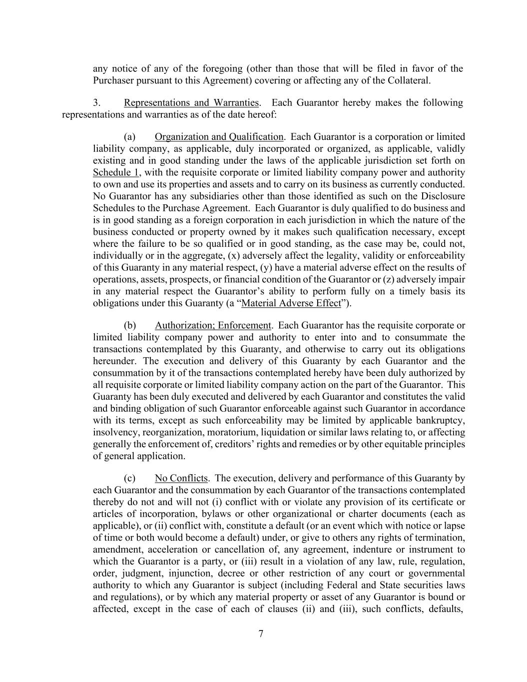 7 any notice of any of the foregoing (other than those that will be filed in favor of the Purchaser pursuant to this Agreement) covering or affecting any of the Collateral. 3. Representations and Warranties. Each Guarantor hereby makes the following representations and warranties as of the date hereof: (a) Organization and Qualification. Each Guarantor is a corporation or limited liability company, as applicable, duly incorporated or organized, as applicable, validly existing and in good standing under the laws of the applicable jurisdiction set forth on Schedule 1, with the requisite corporate or limited liability company power and authority to own and use its properties and assets and to carry on its business as currently conducted. No Guarantor has any subsidiaries other than those identified as such on the Disclosure Schedules to the Purchase Agreement. Each Guarantor is duly qualified to do business and is in good standing as a foreign corporation in each jurisdiction in which the nature of the business conducted or property owned by it makes such qualification necessary, except where the failure to be so qualified or in good standing, as the case may be, could not, individually or in the aggregate, (x) adversely affect the legality, validity or enforceability of this Guaranty in any material respect, (y) have a material adverse effect on the results of operations, assets, prospects, or financial condition of the Guarantor or (z) adversely impair in any material respect the Guarantor’s ability to perform fully on a timely basis its obligations under this Guaranty (a “Material Adverse Effect”). (b) Authorization; Enforcement. Each Guarantor has the requisite corporate or limited liability company power and authority to enter into and to consummate the transactions contemplated by this Guaranty, and otherwise to carry out its obligations hereunder. The execution and delivery of this Guaranty by each Guarantor and the consummation by it of the transactions contemplated hereby have been duly authorized by all requisite corporate or limited liability company action on the part of the Guarantor. This Guaranty has been duly executed and delivered by each Guarantor and constitutes the valid and binding obligation of such Guarantor enforceable against such Guarantor in accordance with its terms, except as such enforceability may be limited by applicable bankruptcy, insolvency, reorganization, moratorium, liquidation or similar laws relating to, or affecting generally the enforcement of, creditors’ rights and remedies or by other equitable principles of general application. (c) No Conflicts. The execution, delivery and performance of this Guaranty by each Guarantor and the consummation by each Guarantor of the transactions contemplated thereby do not and will not (i) conflict with or violate any provision of its certificate or articles of incorporation, bylaws or other organizational or charter documents (each as applicable), or (ii) conflict with, constitute a default (or an event which with notice or lapse of time or both would become a default) under, or give to others any rights of termination, amendment, acceleration or cancellation of, any agreement, indenture or instrument to which the Guarantor is a party, or (iii) result in a violation of any law, rule, regulation, order, judgment, injunction, decree or other restriction of any court or governmental authority to which any Guarantor is subject (including Federal and State securities laws and regulations), or by which any material property or asset of any Guarantor is bound or affected, except in the case of each of clauses (ii) and (iii), such conflicts, defaults,