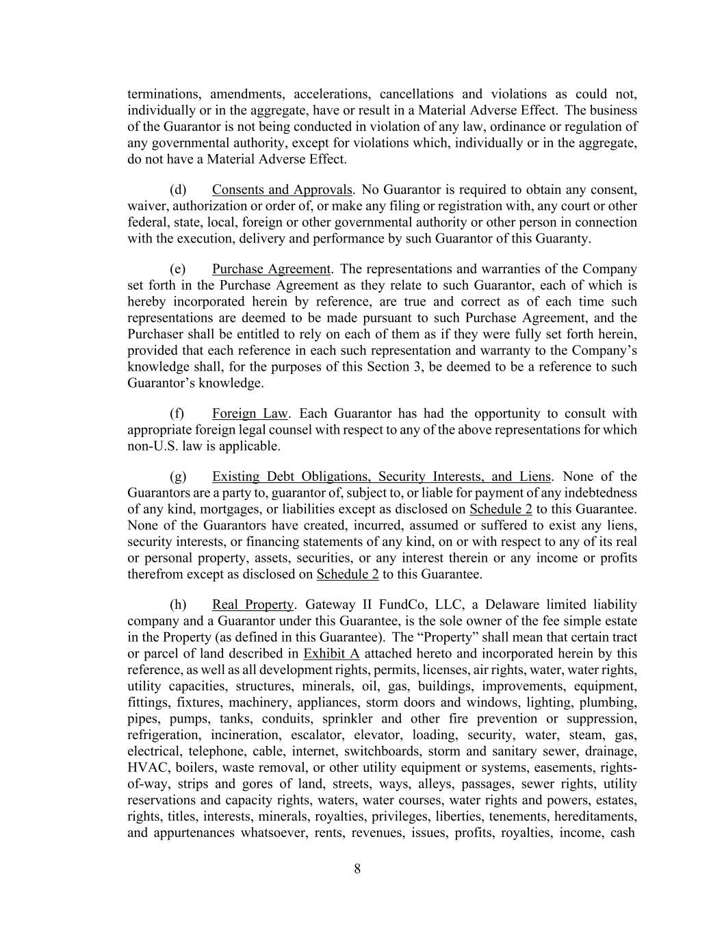 8 terminations, amendments, accelerations, cancellations and violations as could not, individually or in the aggregate, have or result in a Material Adverse Effect. The business of the Guarantor is not being conducted in violation of any law, ordinance or regulation of any governmental authority, except for violations which, individually or in the aggregate, do not have a Material Adverse Effect. (d) Consents and Approvals. No Guarantor is required to obtain any consent, waiver, authorization or order of, or make any filing or registration with, any court or other federal, state, local, foreign or other governmental authority or other person in connection with the execution, delivery and performance by such Guarantor of this Guaranty. (e) Purchase Agreement. The representations and warranties of the Company set forth in the Purchase Agreement as they relate to such Guarantor, each of which is hereby incorporated herein by reference, are true and correct as of each time such representations are deemed to be made pursuant to such Purchase Agreement, and the Purchaser shall be entitled to rely on each of them as if they were fully set forth herein, provided that each reference in each such representation and warranty to the Company’s knowledge shall, for the purposes of this Section 3, be deemed to be a reference to such Guarantor’s knowledge. (f) Foreign Law. Each Guarantor has had the opportunity to consult with appropriate foreign legal counsel with respect to any of the above representations for which non-U.S. law is applicable. (g) Existing Debt Obligations, Security Interests, and Liens. None of the Guarantors are a party to, guarantor of, subject to, or liable for payment of any indebtedness of any kind, mortgages, or liabilities except as disclosed on Schedule 2 to this Guarantee. None of the Guarantors have created, incurred, assumed or suffered to exist any liens, security interests, or financing statements of any kind, on or with respect to any of its real or personal property, assets, securities, or any interest therein or any income or profits therefrom except as disclosed on Schedule 2 to this Guarantee. (h) Real Property. Gateway II FundCo, LLC, a Delaware limited liability company and a Guarantor under this Guarantee, is the sole owner of the fee simple estate in the Property (as defined in this Guarantee). The “Property” shall mean that certain tract or parcel of land described in Exhibit A attached hereto and incorporated herein by this reference, as well as all development rights, permits, licenses, air rights, water, water rights, utility capacities, structures, minerals, oil, gas, buildings, improvements, equipment, fittings, fixtures, machinery, appliances, storm doors and windows, lighting, plumbing, pipes, pumps, tanks, conduits, sprinkler and other fire prevention or suppression, refrigeration, incineration, escalator, elevator, loading, security, water, steam, gas, electrical, telephone, cable, internet, switchboards, storm and sanitary sewer, drainage, HVAC, boilers, waste removal, or other utility equipment or systems, easements, rights- of-way, strips and gores of land, streets, ways, alleys, passages, sewer rights, utility reservations and capacity rights, waters, water courses, water rights and powers, estates, rights, titles, interests, minerals, royalties, privileges, liberties, tenements, hereditaments, and appurtenances whatsoever, rents, revenues, issues, profits, royalties, income, cash