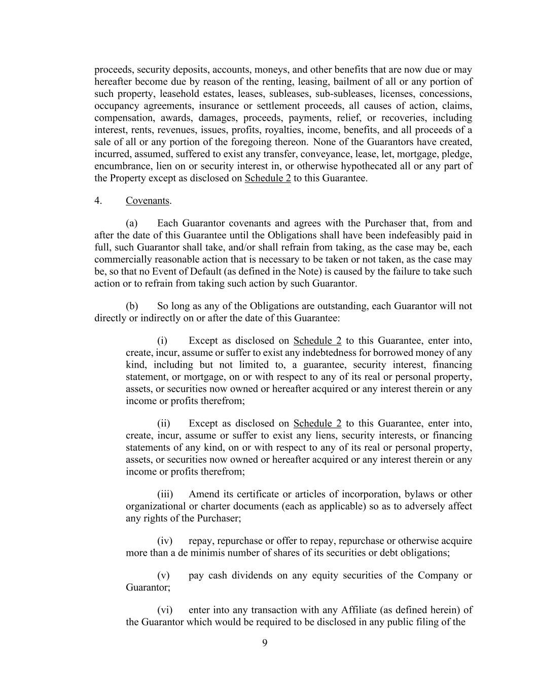9 proceeds, security deposits, accounts, moneys, and other benefits that are now due or may hereafter become due by reason of the renting, leasing, bailment of all or any portion of such property, leasehold estates, leases, subleases, sub-subleases, licenses, concessions, occupancy agreements, insurance or settlement proceeds, all causes of action, claims, compensation, awards, damages, proceeds, payments, relief, or recoveries, including interest, rents, revenues, issues, profits, royalties, income, benefits, and all proceeds of a sale of all or any portion of the foregoing thereon. None of the Guarantors have created, incurred, assumed, suffered to exist any transfer, conveyance, lease, let, mortgage, pledge, encumbrance, lien on or security interest in, or otherwise hypothecated all or any part of the Property except as disclosed on Schedule 2 to this Guarantee. 4. Covenants. (a) Each Guarantor covenants and agrees with the Purchaser that, from and after the date of this Guarantee until the Obligations shall have been indefeasibly paid in full, such Guarantor shall take, and/or shall refrain from taking, as the case may be, each commercially reasonable action that is necessary to be taken or not taken, as the case may be, so that no Event of Default (as defined in the Note) is caused by the failure to take such action or to refrain from taking such action by such Guarantor. (b) So long as any of the Obligations are outstanding, each Guarantor will not directly or indirectly on or after the date of this Guarantee: (i) Except as disclosed on Schedule 2 to this Guarantee, enter into, create, incur, assume or suffer to exist any indebtedness for borrowed money of any kind, including but not limited to, a guarantee, security interest, financing statement, or mortgage, on or with respect to any of its real or personal property, assets, or securities now owned or hereafter acquired or any interest therein or any income or profits therefrom; (ii) Except as disclosed on Schedule 2 to this Guarantee, enter into, create, incur, assume or suffer to exist any liens, security interests, or financing statements of any kind, on or with respect to any of its real or personal property, assets, or securities now owned or hereafter acquired or any interest therein or any income or profits therefrom; (iii) Amend its certificate or articles of incorporation, bylaws or other organizational or charter documents (each as applicable) so as to adversely affect any rights of the Purchaser; (iv) repay, repurchase or offer to repay, repurchase or otherwise acquire more than a de minimis number of shares of its securities or debt obligations; (v) pay cash dividends on any equity securities of the Company or Guarantor; (vi) enter into any transaction with any Affiliate (as defined herein) of the Guarantor which would be required to be disclosed in any public filing of the