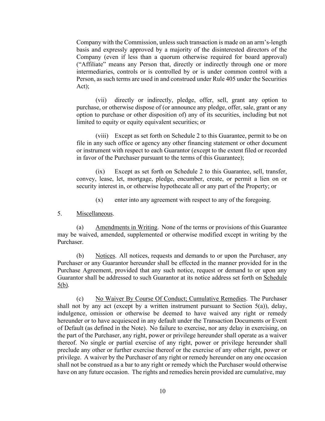10 Company with the Commission, unless such transaction is made on an arm’s-length basis and expressly approved by a majority of the disinterested directors of the Company (even if less than a quorum otherwise required for board approval) (“Affiliate” means any Person that, directly or indirectly through one or more intermediaries, controls or is controlled by or is under common control with a Person, as such terms are used in and construed under Rule 405 under the Securities Act); (vii) directly or indirectly, pledge, offer, sell, grant any option to purchase, or otherwise dispose of (or announce any pledge, offer, sale, grant or any option to purchase or other disposition of) any of its securities, including but not limited to equity or equity equivalent securities; or (viii) Except as set forth on Schedule 2 to this Guarantee, permit to be on file in any such office or agency any other financing statement or other document or instrument with respect to each Guarantor (except to the extent filed or recorded in favor of the Purchaser pursuant to the terms of this Guarantee); (ix) Except as set forth on Schedule 2 to this Guarantee, sell, transfer, convey, lease, let, mortgage, pledge, encumber, create, or permit a lien on or security interest in, or otherwise hypothecate all or any part of the Property; or (x) enter into any agreement with respect to any of the foregoing. 5. Miscellaneous. (a) Amendments in Writing. None of the terms or provisions of this Guarantee may be waived, amended, supplemented or otherwise modified except in writing by the Purchaser. (b) Notices. All notices, requests and demands to or upon the Purchaser, any Purchaser or any Guarantor hereunder shall be effected in the manner provided for in the Purchase Agreement, provided that any such notice, request or demand to or upon any Guarantor shall be addressed to such Guarantor at its notice address set forth on Schedule 5(b). (c) No Waiver By Course Of Conduct; Cumulative Remedies. The Purchaser shall not by any act (except by a written instrument pursuant to Section 5(a)), delay, indulgence, omission or otherwise be deemed to have waived any right or remedy hereunder or to have acquiesced in any default under the Transaction Documents or Event of Default (as defined in the Note). No failure to exercise, nor any delay in exercising, on the part of the Purchaser, any right, power or privilege hereunder shall operate as a waiver thereof. No single or partial exercise of any right, power or privilege hereunder shall preclude any other or further exercise thereof or the exercise of any other right, power or privilege. A waiver by the Purchaser of any right or remedy hereunder on any one occasion shall not be construed as a bar to any right or remedy which the Purchaser would otherwise have on any future occasion. The rights and remedies herein provided are cumulative, may