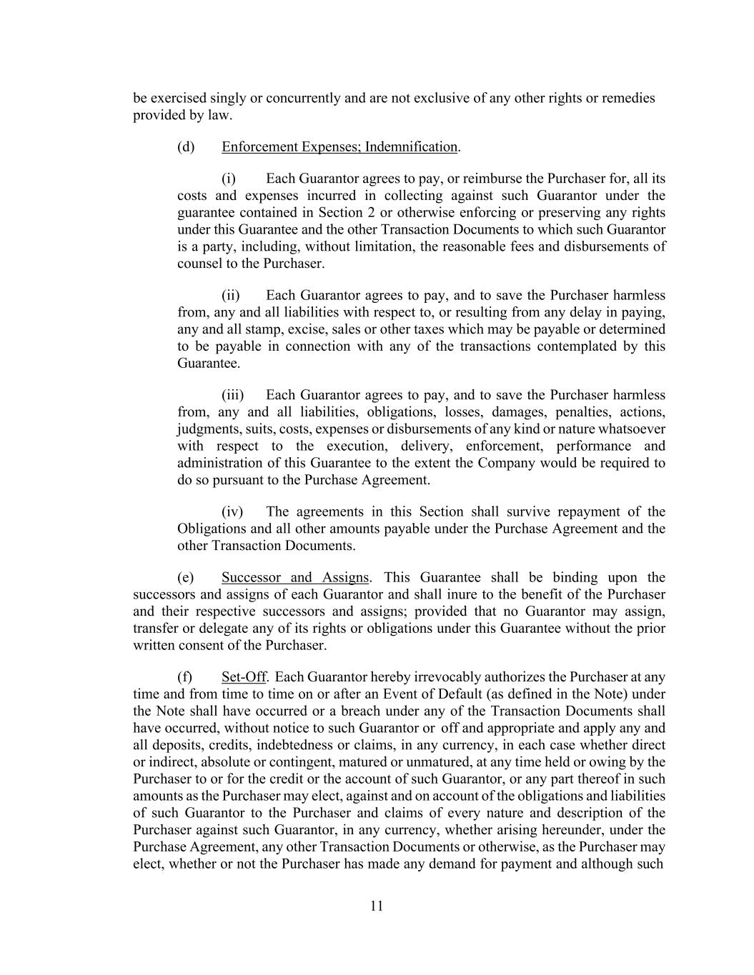 11 be exercised singly or concurrently and are not exclusive of any other rights or remedies provided by law. (d) Enforcement Expenses; Indemnification. (i) Each Guarantor agrees to pay, or reimburse the Purchaser for, all its costs and expenses incurred in collecting against such Guarantor under the guarantee contained in Section 2 or otherwise enforcing or preserving any rights under this Guarantee and the other Transaction Documents to which such Guarantor is a party, including, without limitation, the reasonable fees and disbursements of counsel to the Purchaser. (ii) Each Guarantor agrees to pay, and to save the Purchaser harmless from, any and all liabilities with respect to, or resulting from any delay in paying, any and all stamp, excise, sales or other taxes which may be payable or determined to be payable in connection with any of the transactions contemplated by this Guarantee. (iii) Each Guarantor agrees to pay, and to save the Purchaser harmless from, any and all liabilities, obligations, losses, damages, penalties, actions, judgments, suits, costs, expenses or disbursements of any kind or nature whatsoever with respect to the execution, delivery, enforcement, performance and administration of this Guarantee to the extent the Company would be required to do so pursuant to the Purchase Agreement. (iv) The agreements in this Section shall survive repayment of the Obligations and all other amounts payable under the Purchase Agreement and the other Transaction Documents. (e) Successor and Assigns. This Guarantee shall be binding upon the successors and assigns of each Guarantor and shall inure to the benefit of the Purchaser and their respective successors and assigns; provided that no Guarantor may assign, transfer or delegate any of its rights or obligations under this Guarantee without the prior written consent of the Purchaser. (f) Set-Off. Each Guarantor hereby irrevocably authorizes the Purchaser at any time and from time to time on or after an Event of Default (as defined in the Note) under the Note shall have occurred or a breach under any of the Transaction Documents shall have occurred, without notice to such Guarantor or off and appropriate and apply any and all deposits, credits, indebtedness or claims, in any currency, in each case whether direct or indirect, absolute or contingent, matured or unmatured, at any time held or owing by the Purchaser to or for the credit or the account of such Guarantor, or any part thereof in such amounts as the Purchaser may elect, against and on account of the obligations and liabilities of such Guarantor to the Purchaser and claims of every nature and description of the Purchaser against such Guarantor, in any currency, whether arising hereunder, under the Purchase Agreement, any other Transaction Documents or otherwise, as the Purchaser may elect, whether or not the Purchaser has made any demand for payment and although such