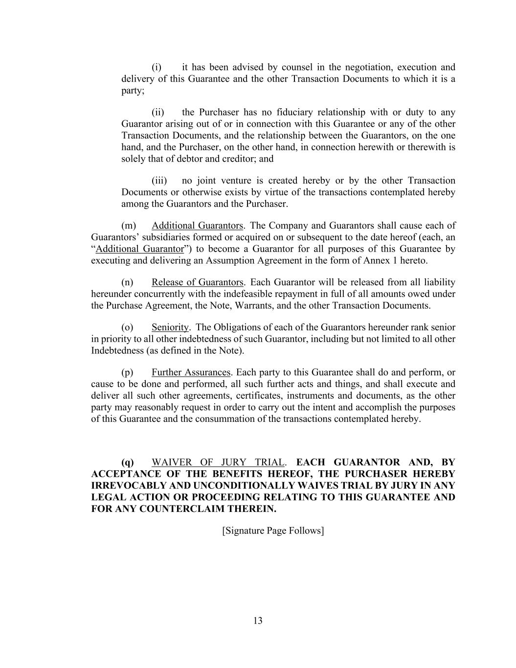 13 (i) it has been advised by counsel in the negotiation, execution and delivery of this Guarantee and the other Transaction Documents to which it is a party; (ii) the Purchaser has no fiduciary relationship with or duty to any Guarantor arising out of or in connection with this Guarantee or any of the other Transaction Documents, and the relationship between the Guarantors, on the one hand, and the Purchaser, on the other hand, in connection herewith or therewith is solely that of debtor and creditor; and (iii) no joint venture is created hereby or by the other Transaction Documents or otherwise exists by virtue of the transactions contemplated hereby among the Guarantors and the Purchaser. (m) Additional Guarantors. The Company and Guarantors shall cause each of Guarantors’ subsidiaries formed or acquired on or subsequent to the date hereof (each, an “Additional Guarantor”) to become a Guarantor for all purposes of this Guarantee by executing and delivering an Assumption Agreement in the form of Annex 1 hereto. (n) Release of Guarantors. Each Guarantor will be released from all liability hereunder concurrently with the indefeasible repayment in full of all amounts owed under the Purchase Agreement, the Note, Warrants, and the other Transaction Documents. (o) Seniority. The Obligations of each of the Guarantors hereunder rank senior in priority to all other indebtedness of such Guarantor, including but not limited to all other Indebtedness (as defined in the Note). (p) Further Assurances. Each party to this Guarantee shall do and perform, or cause to be done and performed, all such further acts and things, and shall execute and deliver all such other agreements, certificates, instruments and documents, as the other party may reasonably request in order to carry out the intent and accomplish the purposes of this Guarantee and the consummation of the transactions contemplated hereby. (q) WAIVER OF JURY TRIAL. EACH GUARANTOR AND, BY ACCEPTANCE OF THE BENEFITS HEREOF, THE PURCHASER HEREBY IRREVOCABLY AND UNCONDITIONALLY WAIVES TRIAL BY JURY IN ANY LEGAL ACTION OR PROCEEDING RELATING TO THIS GUARANTEE AND FOR ANY COUNTERCLAIM THEREIN. [Signature Page Follows]