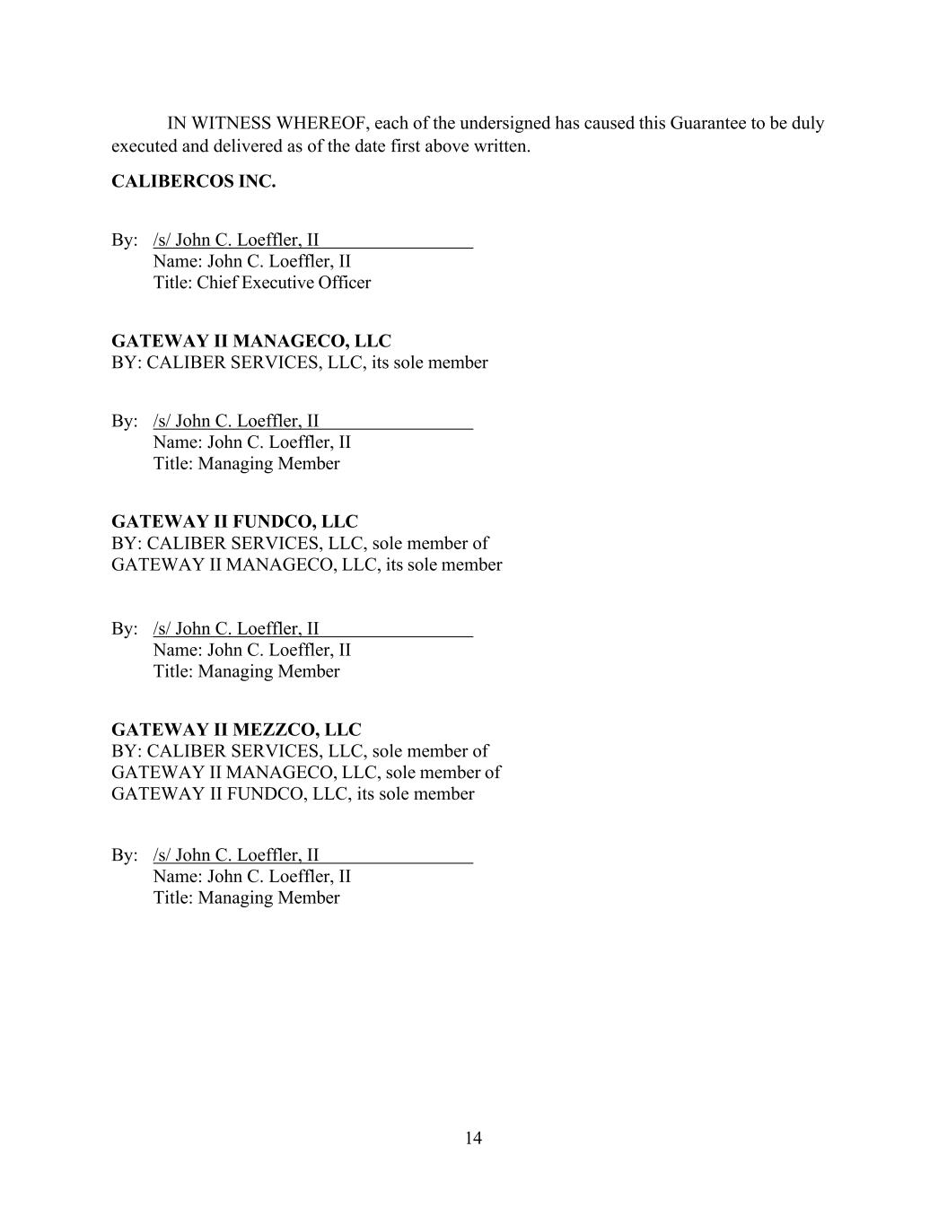 14 IN WITNESS WHEREOF, each of the undersigned has caused this Guarantee to be duly executed and delivered as of the date first above written. CALIBERCOS INC. By: /s/ John C. Loeffler, II Name: John C. Loeffler, II Title: Chief Executive Officer GATEWAY II MANAGECO, LLC BY: CALIBER SERVICES, LLC, its sole member By: /s/ John C. Loeffler, II Name: John C. Loeffler, II Title: Managing Member GATEWAY II FUNDCO, LLC BY: CALIBER SERVICES, LLC, sole member of GATEWAY II MANAGECO, LLC, its sole member By: /s/ John C. Loeffler, II Name: John C. Loeffler, II Title: Managing Member GATEWAY II MEZZCO, LLC BY: CALIBER SERVICES, LLC, sole member of GATEWAY II MANAGECO, LLC, sole member of GATEWAY II FUNDCO, LLC, its sole member By: /s/ John C. Loeffler, II Name: John C. Loeffler, II Title: Managing Member