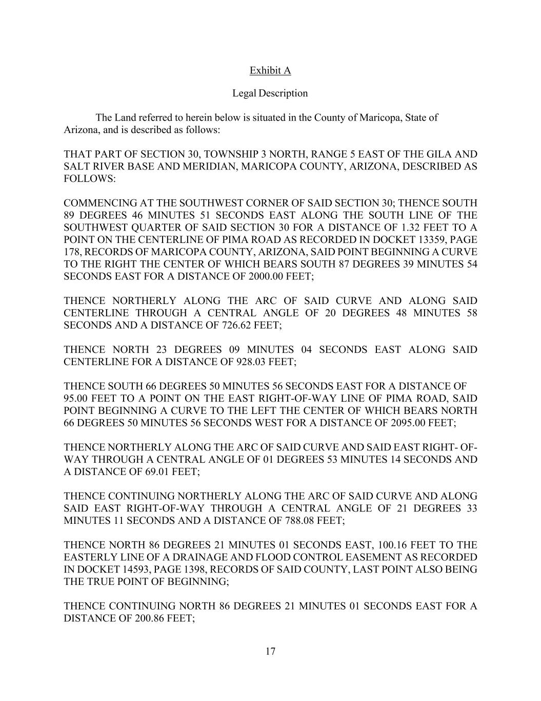 17 Exhibit A Legal Description The Land referred to herein below is situated in the County of Maricopa, State of Arizona, and is described as follows: THAT PART OF SECTION 30, TOWNSHIP 3 NORTH, RANGE 5 EAST OF THE GILA AND SALT RIVER BASE AND MERIDIAN, MARICOPA COUNTY, ARIZONA, DESCRIBED AS FOLLOWS: COMMENCING AT THE SOUTHWEST CORNER OF SAID SECTION 30; THENCE SOUTH 89 DEGREES 46 MINUTES 51 SECONDS EAST ALONG THE SOUTH LINE OF THE SOUTHWEST QUARTER OF SAID SECTION 30 FOR A DISTANCE OF 1.32 FEET TO A POINT ON THE CENTERLINE OF PIMA ROAD AS RECORDED IN DOCKET 13359, PAGE 178, RECORDS OF MARICOPA COUNTY, ARIZONA, SAID POINT BEGINNING A CURVE TO THE RIGHT THE CENTER OF WHICH BEARS SOUTH 87 DEGREES 39 MINUTES 54 SECONDS EAST FOR A DISTANCE OF 2000.00 FEET; THENCE NORTHERLY ALONG THE ARC OF SAID CURVE AND ALONG SAID CENTERLINE THROUGH A CENTRAL ANGLE OF 20 DEGREES 48 MINUTES 58 SECONDS AND A DISTANCE OF 726.62 FEET; THENCE NORTH 23 DEGREES 09 MINUTES 04 SECONDS EAST ALONG SAID CENTERLINE FOR A DISTANCE OF 928.03 FEET; THENCE SOUTH 66 DEGREES 50 MINUTES 56 SECONDS EAST FOR A DISTANCE OF 95.00 FEET TO A POINT ON THE EAST RIGHT-OF-WAY LINE OF PIMA ROAD, SAID POINT BEGINNING A CURVE TO THE LEFT THE CENTER OF WHICH BEARS NORTH 66 DEGREES 50 MINUTES 56 SECONDS WEST FOR A DISTANCE OF 2095.00 FEET; THENCE NORTHERLY ALONG THE ARC OF SAID CURVE AND SAID EAST RIGHT- OF- WAY THROUGH A CENTRAL ANGLE OF 01 DEGREES 53 MINUTES 14 SECONDS AND A DISTANCE OF 69.01 FEET; THENCE CONTINUING NORTHERLY ALONG THE ARC OF SAID CURVE AND ALONG SAID EAST RIGHT-OF-WAY THROUGH A CENTRAL ANGLE OF 21 DEGREES 33 MINUTES 11 SECONDS AND A DISTANCE OF 788.08 FEET; THENCE NORTH 86 DEGREES 21 MINUTES 01 SECONDS EAST, 100.16 FEET TO THE EASTERLY LINE OF A DRAINAGE AND FLOOD CONTROL EASEMENT AS RECORDED IN DOCKET 14593, PAGE 1398, RECORDS OF SAID COUNTY, LAST POINT ALSO BEING THE TRUE POINT OF BEGINNING; THENCE CONTINUING NORTH 86 DEGREES 21 MINUTES 01 SECONDS EAST FOR A DISTANCE OF 200.86 FEET;