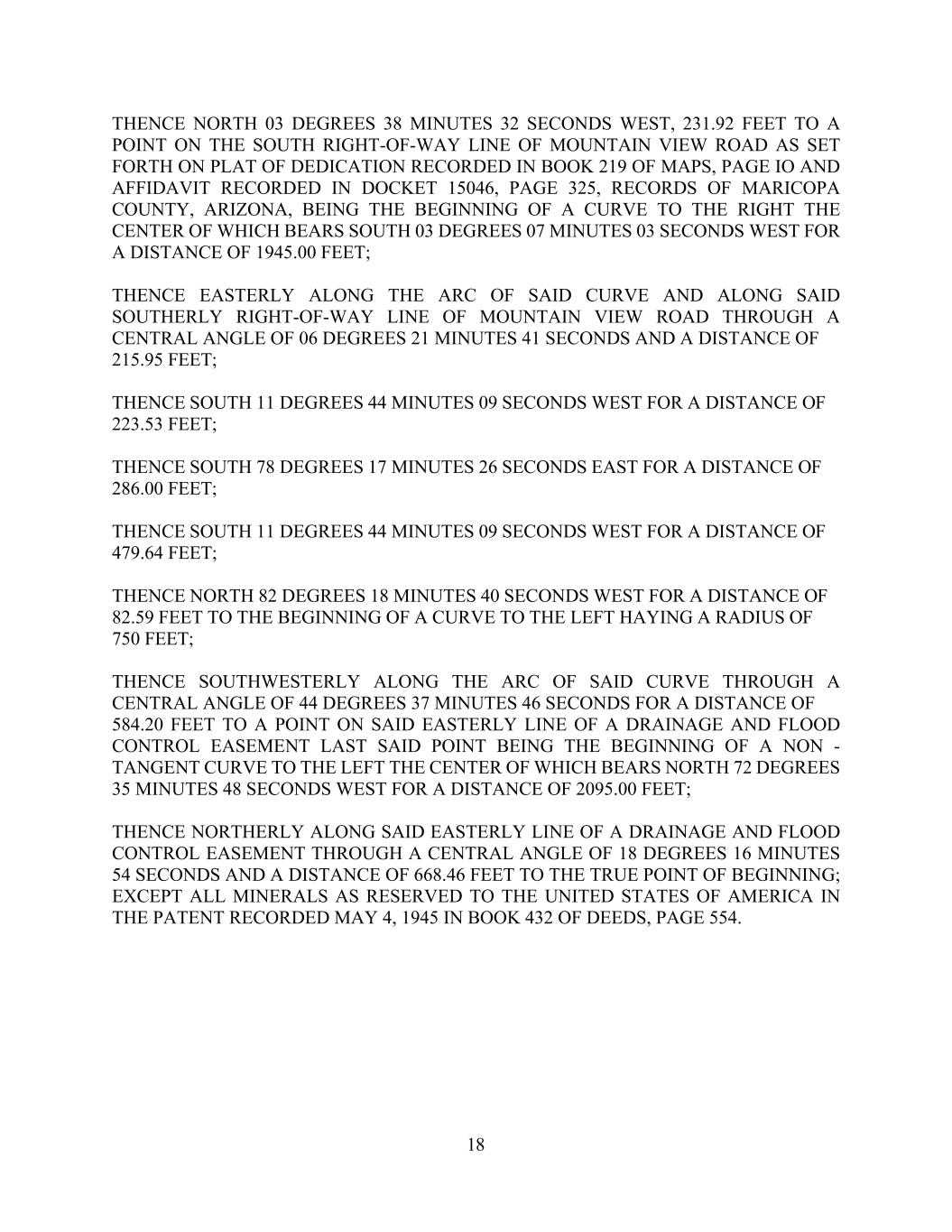 18 THENCE NORTH 03 DEGREES 38 MINUTES 32 SECONDS WEST, 231.92 FEET TO A POINT ON THE SOUTH RIGHT-OF-WAY LINE OF MOUNTAIN VIEW ROAD AS SET FORTH ON PLAT OF DEDICATION RECORDED IN BOOK 219 OF MAPS, PAGE IO AND AFFIDAVIT RECORDED IN DOCKET 15046, PAGE 325, RECORDS OF MARICOPA COUNTY, ARIZONA, BEING THE BEGINNING OF A CURVE TO THE RIGHT THE CENTER OF WHICH BEARS SOUTH 03 DEGREES 07 MINUTES 03 SECONDS WEST FOR A DISTANCE OF 1945.00 FEET; THENCE EASTERLY ALONG THE ARC OF SAID CURVE AND ALONG SAID SOUTHERLY RIGHT-OF-WAY LINE OF MOUNTAIN VIEW ROAD THROUGH A CENTRAL ANGLE OF 06 DEGREES 21 MINUTES 41 SECONDS AND A DISTANCE OF 215.95 FEET; THENCE SOUTH 11 DEGREES 44 MINUTES 09 SECONDS WEST FOR A DISTANCE OF 223.53 FEET; THENCE SOUTH 78 DEGREES 17 MINUTES 26 SECONDS EAST FOR A DISTANCE OF 286.00 FEET; THENCE SOUTH 11 DEGREES 44 MINUTES 09 SECONDS WEST FOR A DISTANCE OF 479.64 FEET; THENCE NORTH 82 DEGREES 18 MINUTES 40 SECONDS WEST FOR A DISTANCE OF 82.59 FEET TO THE BEGINNING OF A CURVE TO THE LEFT HAYING A RADIUS OF 750 FEET; THENCE SOUTHWESTERLY ALONG THE ARC OF SAID CURVE THROUGH A CENTRAL ANGLE OF 44 DEGREES 37 MINUTES 46 SECONDS FOR A DISTANCE OF 584.20 FEET TO A POINT ON SAID EASTERLY LINE OF A DRAINAGE AND FLOOD CONTROL EASEMENT LAST SAID POINT BEING THE BEGINNING OF A NON - TANGENT CURVE TO THE LEFT THE CENTER OF WHICH BEARS NORTH 72 DEGREES 35 MINUTES 48 SECONDS WEST FOR A DISTANCE OF 2095.00 FEET; THENCE NORTHERLY ALONG SAID EASTERLY LINE OF A DRAINAGE AND FLOOD CONTROL EASEMENT THROUGH A CENTRAL ANGLE OF 18 DEGREES 16 MINUTES 54 SECONDS AND A DISTANCE OF 668.46 FEET TO THE TRUE POINT OF BEGINNING; EXCEPT ALL MINERALS AS RESERVED TO THE UNITED STATES OF AMERICA IN THE PATENT RECORDED MAY 4, 1945 IN BOOK 432 OF DEEDS, PAGE 554.