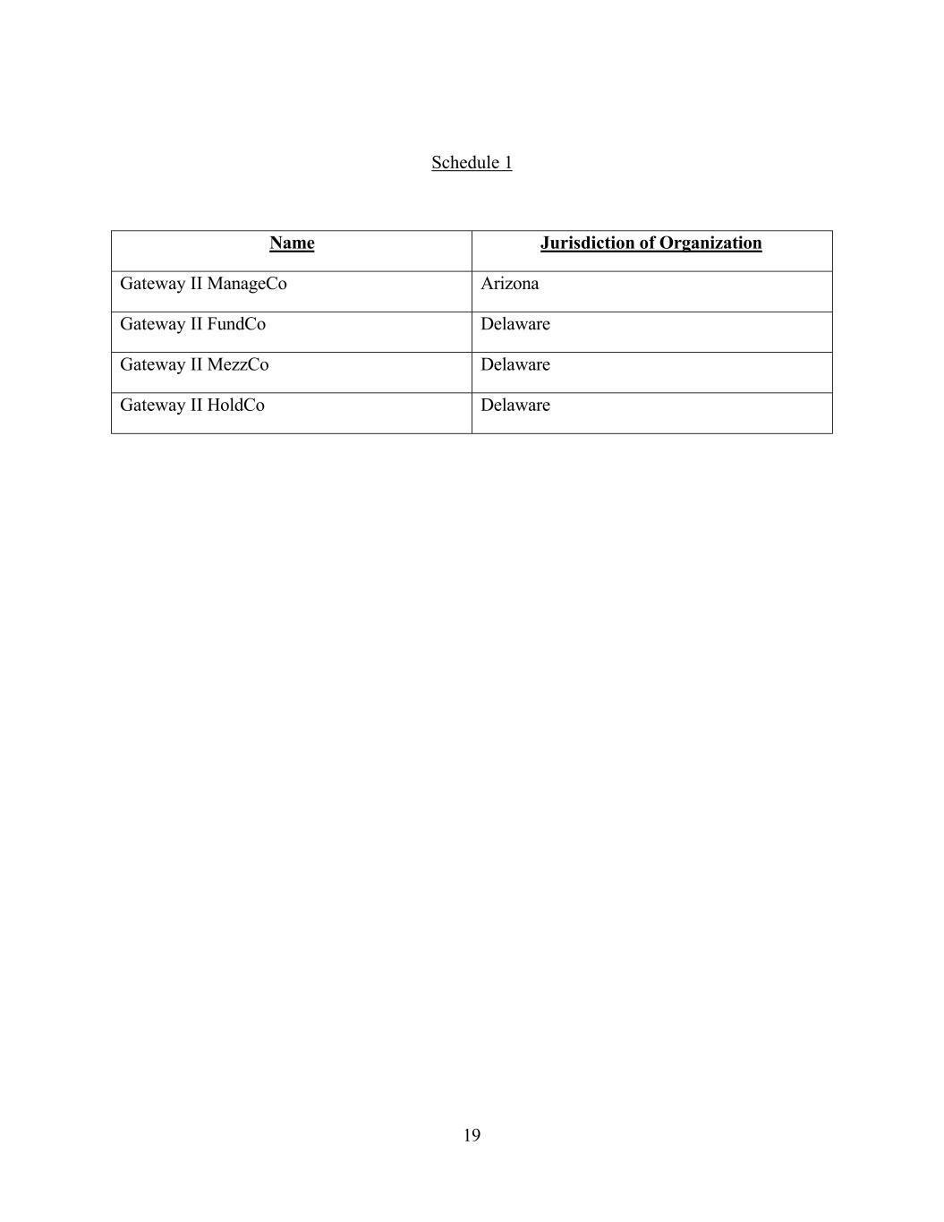 19 Schedule 1 Name Jurisdiction of Organization Gateway II ManageCo Arizona Gateway II FundCo Delaware Gateway II MezzCo Delaware Gateway II HoldCo Delaware