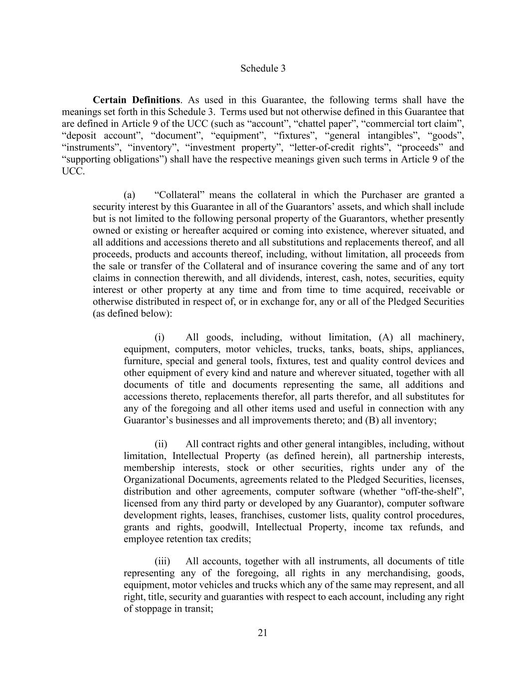 21 Schedule 3 Certain Definitions. As used in this Guarantee, the following terms shall have the meanings set forth in this Schedule 3. Terms used but not otherwise defined in this Guarantee that are defined in Article 9 of the UCC (such as “account”, “chattel paper”, “commercial tort claim”, “deposit account”, “document”, “equipment”, “fixtures”, “general intangibles”, “goods”, “instruments”, “inventory”, “investment property”, “letter-of-credit rights”, “proceeds” and “supporting obligations”) shall have the respective meanings given such terms in Article 9 of the UCC. (a) “Collateral” means the collateral in which the Purchaser are granted a security interest by this Guarantee in all of the Guarantors’ assets, and which shall include but is not limited to the following personal property of the Guarantors, whether presently owned or existing or hereafter acquired or coming into existence, wherever situated, and all additions and accessions thereto and all substitutions and replacements thereof, and all proceeds, products and accounts thereof, including, without limitation, all proceeds from the sale or transfer of the Collateral and of insurance covering the same and of any tort claims in connection therewith, and all dividends, interest, cash, notes, securities, equity interest or other property at any time and from time to time acquired, receivable or otherwise distributed in respect of, or in exchange for, any or all of the Pledged Securities (as defined below): (i) All goods, including, without limitation, (A) all machinery, equipment, computers, motor vehicles, trucks, tanks, boats, ships, appliances, furniture, special and general tools, fixtures, test and quality control devices and other equipment of every kind and nature and wherever situated, together with all documents of title and documents representing the same, all additions and accessions thereto, replacements therefor, all parts therefor, and all substitutes for any of the foregoing and all other items used and useful in connection with any Guarantor’s businesses and all improvements thereto; and (B) all inventory; (ii) All contract rights and other general intangibles, including, without limitation, Intellectual Property (as defined herein), all partnership interests, membership interests, stock or other securities, rights under any of the Organizational Documents, agreements related to the Pledged Securities, licenses, distribution and other agreements, computer software (whether “off-the-shelf”, licensed from any third party or developed by any Guarantor), computer software development rights, leases, franchises, customer lists, quality control procedures, grants and rights, goodwill, Intellectual Property, income tax refunds, and employee retention tax credits; (iii) All accounts, together with all instruments, all documents of title representing any of the foregoing, all rights in any merchandising, goods, equipment, motor vehicles and trucks which any of the same may represent, and all right, title, security and guaranties with respect to each account, including any right of stoppage in transit;