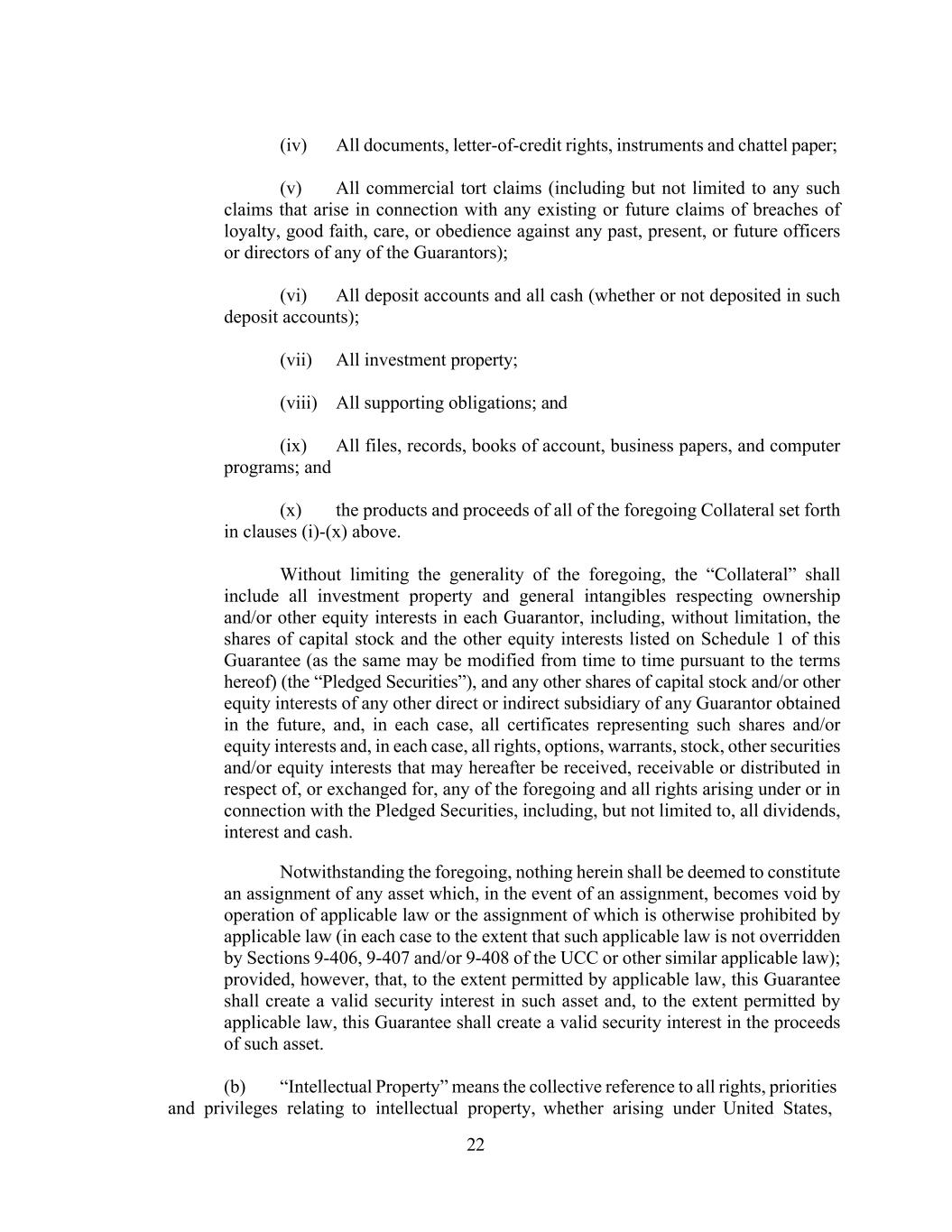 22 (iv) All documents, letter-of-credit rights, instruments and chattel paper; (v) All commercial tort claims (including but not limited to any such claims that arise in connection with any existing or future claims of breaches of loyalty, good faith, care, or obedience against any past, present, or future officers or directors of any of the Guarantors); (vi) All deposit accounts and all cash (whether or not deposited in such deposit accounts); (vii) All investment property; (viii) All supporting obligations; and (ix) All files, records, books of account, business papers, and computer programs; and (x) the products and proceeds of all of the foregoing Collateral set forth in clauses (i)-(x) above. Without limiting the generality of the foregoing, the “Collateral” shall include all investment property and general intangibles respecting ownership and/or other equity interests in each Guarantor, including, without limitation, the shares of capital stock and the other equity interests listed on Schedule 1 of this Guarantee (as the same may be modified from time to time pursuant to the terms hereof) (the “Pledged Securities”), and any other shares of capital stock and/or other equity interests of any other direct or indirect subsidiary of any Guarantor obtained in the future, and, in each case, all certificates representing such shares and/or equity interests and, in each case, all rights, options, warrants, stock, other securities and/or equity interests that may hereafter be received, receivable or distributed in respect of, or exchanged for, any of the foregoing and all rights arising under or in connection with the Pledged Securities, including, but not limited to, all dividends, interest and cash. Notwithstanding the foregoing, nothing herein shall be deemed to constitute an assignment of any asset which, in the event of an assignment, becomes void by operation of applicable law or the assignment of which is otherwise prohibited by applicable law (in each case to the extent that such applicable law is not overridden by Sections 9-406, 9-407 and/or 9-408 of the UCC or other similar applicable law); provided, however, that, to the extent permitted by applicable law, this Guarantee shall create a valid security interest in such asset and, to the extent permitted by applicable law, this Guarantee shall create a valid security interest in the proceeds of such asset. (b) “Intellectual Property” means the collective reference to all rights, priorities and privileges relating to intellectual property, whether arising under United States,