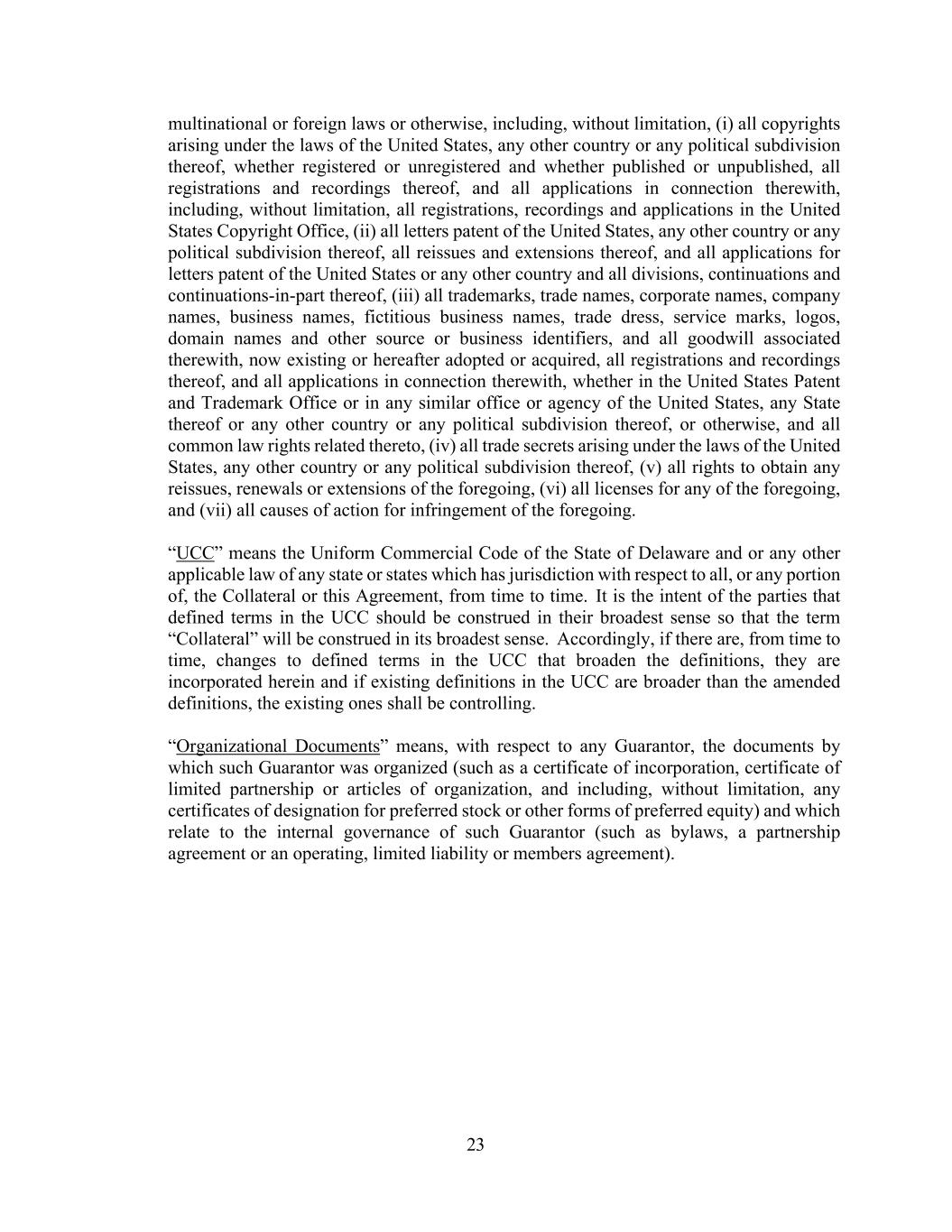 23 multinational or foreign laws or otherwise, including, without limitation, (i) all copyrights arising under the laws of the United States, any other country or any political subdivision thereof, whether registered or unregistered and whether published or unpublished, all registrations and recordings thereof, and all applications in connection therewith, including, without limitation, all registrations, recordings and applications in the United States Copyright Office, (ii) all letters patent of the United States, any other country or any political subdivision thereof, all reissues and extensions thereof, and all applications for letters patent of the United States or any other country and all divisions, continuations and continuations-in-part thereof, (iii) all trademarks, trade names, corporate names, company names, business names, fictitious business names, trade dress, service marks, logos, domain names and other source or business identifiers, and all goodwill associated therewith, now existing or hereafter adopted or acquired, all registrations and recordings thereof, and all applications in connection therewith, whether in the United States Patent and Trademark Office or in any similar office or agency of the United States, any State thereof or any other country or any political subdivision thereof, or otherwise, and all common law rights related thereto, (iv) all trade secrets arising under the laws of the United States, any other country or any political subdivision thereof, (v) all rights to obtain any reissues, renewals or extensions of the foregoing, (vi) all licenses for any of the foregoing, and (vii) all causes of action for infringement of the foregoing. “UCC” means the Uniform Commercial Code of the State of Delaware and or any other applicable law of any state or states which has jurisdiction with respect to all, or any portion of, the Collateral or this Agreement, from time to time. It is the intent of the parties that defined terms in the UCC should be construed in their broadest sense so that the term “Collateral” will be construed in its broadest sense. Accordingly, if there are, from time to time, changes to defined terms in the UCC that broaden the definitions, they are incorporated herein and if existing definitions in the UCC are broader than the amended definitions, the existing ones shall be controlling. “Organizational Documents” means, with respect to any Guarantor, the documents by which such Guarantor was organized (such as a certificate of incorporation, certificate of limited partnership or articles of organization, and including, without limitation, any certificates of designation for preferred stock or other forms of preferred equity) and which relate to the internal governance of such Guarantor (such as bylaws, a partnership agreement or an operating, limited liability or members agreement).