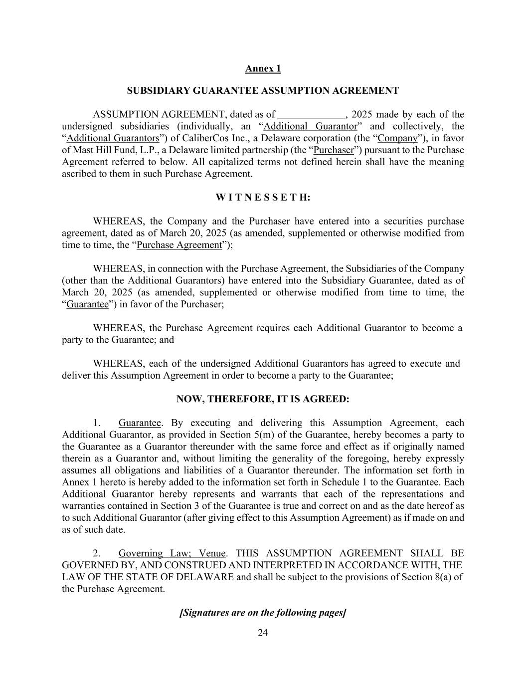 24 Annex 1 SUBSIDIARY GUARANTEE ASSUMPTION AGREEMENT ASSUMPTION AGREEMENT, dated as of , 2025 made by each of the undersigned subsidiaries (individually, an “Additional Guarantor” and collectively, the “Additional Guarantors”) of CaliberCos Inc., a Delaware corporation (the “Company”), in favor of Mast Hill Fund, L.P., a Delaware limited partnership (the “Purchaser”) pursuant to the Purchase Agreement referred to below. All capitalized terms not defined herein shall have the meaning ascribed to them in such Purchase Agreement. W I T N E S S E T H: WHEREAS, the Company and the Purchaser have entered into a securities purchase agreement, dated as of March 20, 2025 (as amended, supplemented or otherwise modified from time to time, the “Purchase Agreement”); WHEREAS, in connection with the Purchase Agreement, the Subsidiaries of the Company (other than the Additional Guarantors) have entered into the Subsidiary Guarantee, dated as of March 20, 2025 (as amended, supplemented or otherwise modified from time to time, the “Guarantee”) in favor of the Purchaser; WHEREAS, the Purchase Agreement requires each Additional Guarantor to become a party to the Guarantee; and WHEREAS, each of the undersigned Additional Guarantors has agreed to execute and deliver this Assumption Agreement in order to become a party to the Guarantee; NOW, THEREFORE, IT IS AGREED: 1. Guarantee. By executing and delivering this Assumption Agreement, each Additional Guarantor, as provided in Section 5(m) of the Guarantee, hereby becomes a party to the Guarantee as a Guarantor thereunder with the same force and effect as if originally named therein as a Guarantor and, without limiting the generality of the foregoing, hereby expressly assumes all obligations and liabilities of a Guarantor thereunder. The information set forth in Annex 1 hereto is hereby added to the information set forth in Schedule 1 to the Guarantee. Each Additional Guarantor hereby represents and warrants that each of the representations and warranties contained in Section 3 of the Guarantee is true and correct on and as the date hereof as to such Additional Guarantor (after giving effect to this Assumption Agreement) as if made on and as of such date. 2. Governing Law; Venue. THIS ASSUMPTION AGREEMENT SHALL BE GOVERNED BY, AND CONSTRUED AND INTERPRETED IN ACCORDANCE WITH, THE LAW OF THE STATE OF DELAWARE and shall be subject to the provisions of Section 8(a) of the Purchase Agreement. [Signatures are on the following pages]