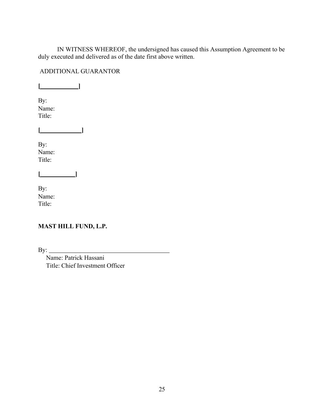 25 IN WITNESS WHEREOF, the undersigned has caused this Assumption Agreement to be duly executed and delivered as of the date first above written. ADDITIONAL GUARANTOR [ ] By: Name: Title: [ ] By: Name: Title: [ ] By: Name: Title: MAST HILL FUND, L.P. By: Name: Patrick Hassani Title: Chief Investment Officer