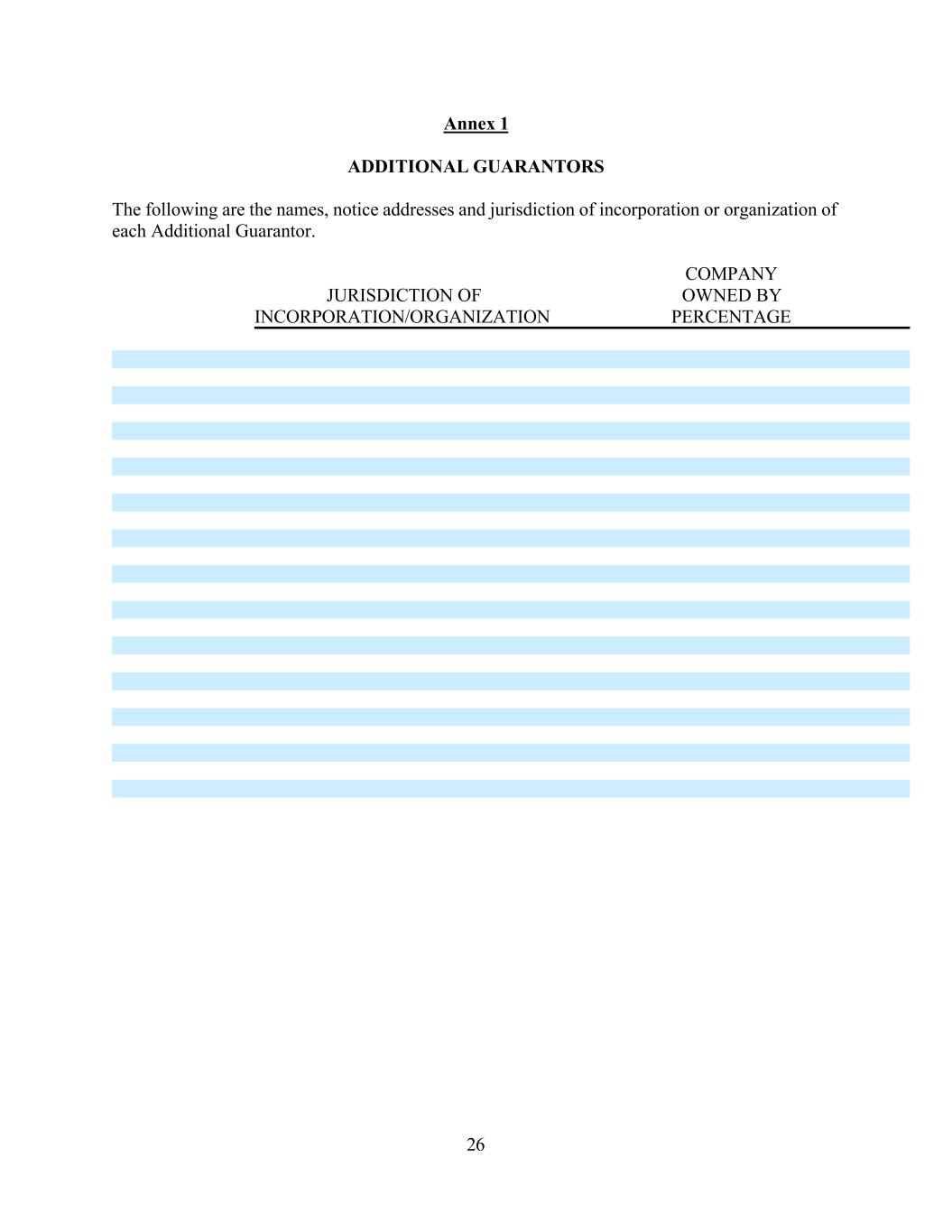 26 Annex 1 ADDITIONAL GUARANTORS The following are the names, notice addresses and jurisdiction of incorporation or organization of each Additional Guarantor. COMPANY JURISDICTION OF OWNED BY INCORPORATION/ORGANIZATION PERCENTAGE
