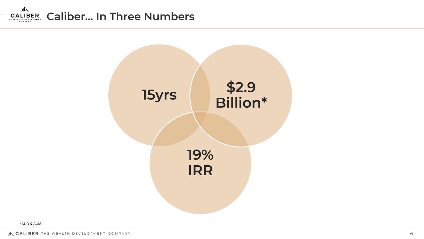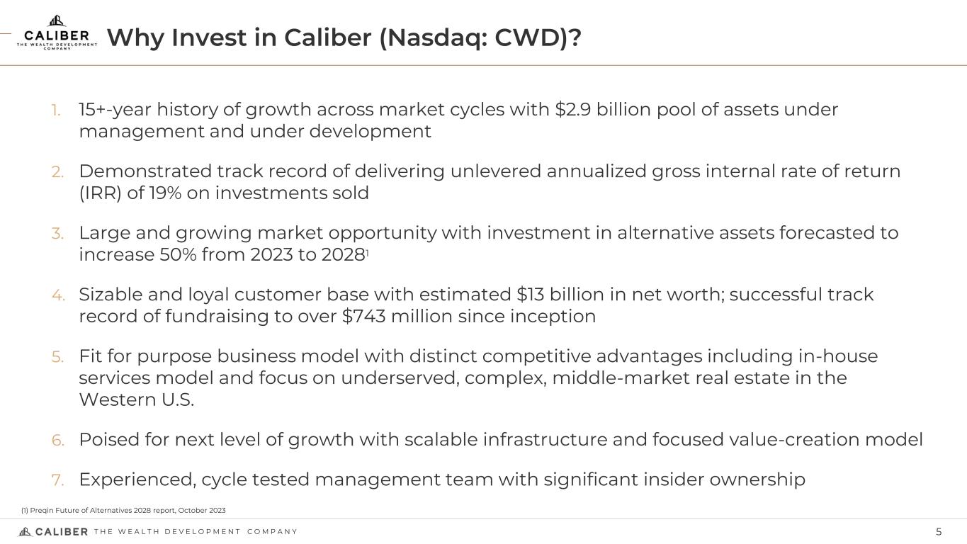 1. 15+-year history of growth across market cycles with $2.9 billion pool of assets under management and under development 2. Demonstrated track record of delivering unlevered annualized gross internal rate of return (IRR) of 19% on investments sold 3. Large and growing market opportunity with investment in alternative assets forecasted to increase 50% from 2023 to 20281 4. Sizable and loyal customer base with estimated $13 billion in net worth; successful track record of fundraising to over $743 million since inception 5. Fit for purpose business model with distinct competitive advantages including in-house services model and focus on underserved, complex, middle-market real estate in the Western U.S. 6. Poised for next level of growth with scalable infrastructure and focused value-creation model 7. Experienced, cycle tested management team with significant insider ownership Why Invest in Caliber (Nasdaq: CWD)? 5T H E W E A L T H D E V E L O P M E N T C O M P A N Y (1) Preqin Future of Alternatives 2028 report, October 2023