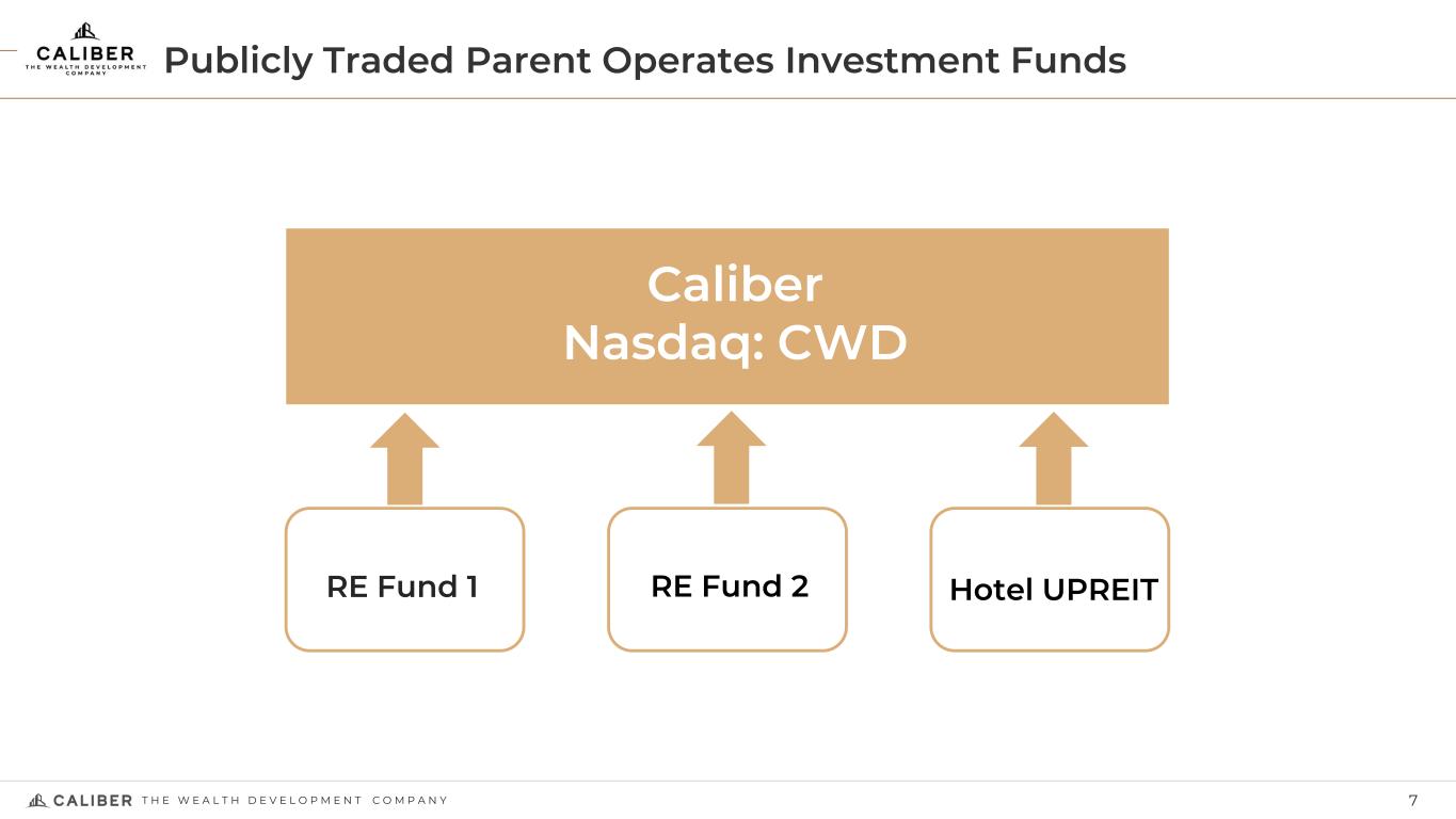 Publicly Traded Parent Operates Investment Funds 7T H E W E A L T H D E V E L O P M E N T C O M P A N Y Caliber Nasdaq: CWD RE Fund 1 RE Fund 2 Hotel UPREIT