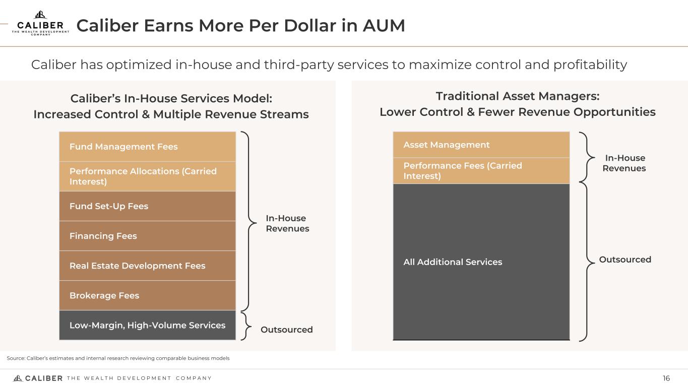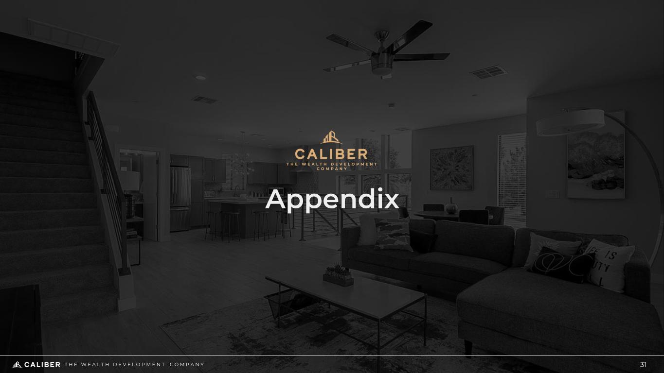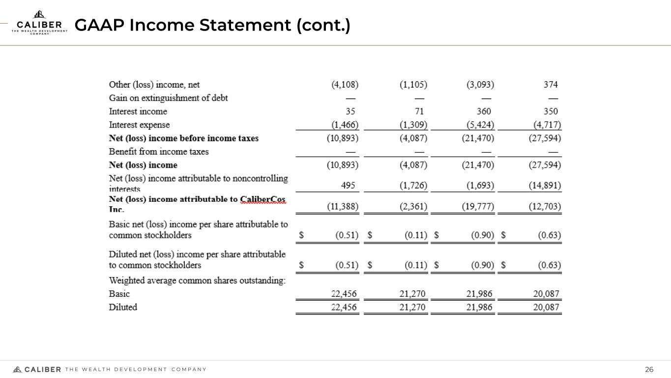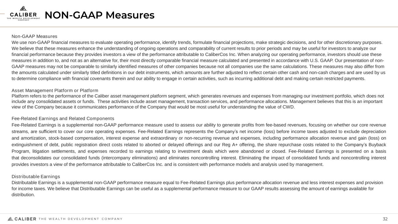 32T H E W E A L T H D E V E L O P M E N T C O M P A N Y Non-GAAP Measures We use non-GAAP financial measures to evaluate operating performance, identify trends, formulate financial projections, make strategic decisions, and for other discretionary purposes. We believe that these measures enhance the understanding of ongoing operations and comparability of current results to prior periods and may be useful for investors to analyze our financial performance because they provides investors a view of the performance attributable to CaliberCos Inc. When analyzing our operating performance, investors should use these measures in addition to, and not as an alternative for, their most directly comparable financial measure calculated and presented in accordance with U.S. GAAP. Our presentation of non- GAAP measures may not be comparable to similarly identified measures of other companies because not all companies use the same calculations. These measures may also differ from the amounts calculated under similarly titled definitions in our debt instruments, which amounts are further adjusted to reflect certain other cash and non-cash charges and are used by us to determine compliance with financial covenants therein and our ability to engage in certain activities, such as incurring additional debt and making certain restricted payments. Asset Management Platform or Platform Platform refers to the performance of the Caliber asset management platform segment, which generates revenues and expenses from managing our investment portfolio, which does not include any consolidated assets or funds. These activities include asset management, transaction services, and performance allocations. Management believes that this is an important view of the Company because it communicates performance of the Company that would be most useful for understanding the value of CWD. Fee-Related Earnings and Related Components Fee-Related Earnings is a supplemental non-GAAP performance measure used to assess our ability to generate profits from fee-based revenues, focusing on whether our core revenue streams, are sufficient to cover our core operating expenses. Fee-Related Earnings represents the Company’s net income (loss) before income taxes adjusted to exclude depreciation and amortization, stock-based compensation, interest expense and extraordinary or non-recurring revenue and expenses, including performance allocation revenue and gain (loss) on extinguishment of debt, public registration direct costs related to aborted or delayed offerings and our Reg A+ offering, the share repurchase costs related to the Company’s Buyback Program, litigation settlements, and expenses recorded to earnings relating to investment deals which were abandoned or closed. Fee-Related Earnings is presented on a basis that deconsolidates our consolidated funds (intercompany eliminations) and eliminates noncontrolling interest. Eliminating the impact of consolidated funds and noncontrolling interest provides investors a view of the performance attributable to CaliberCos Inc. and is consistent with performance models and analysis used by management. Distributable Earnings Distributable Earnings is a supplemental non-GAAP performance measure equal to Fee-Related Earnings plus performance allocation revenue and less interest expenses and provision for income taxes. We believe that Distributable Earnings can be useful as a supplemental performance measure to our GAAP results assessing the amount of earnings available for distribution. NON-GAAP Measures