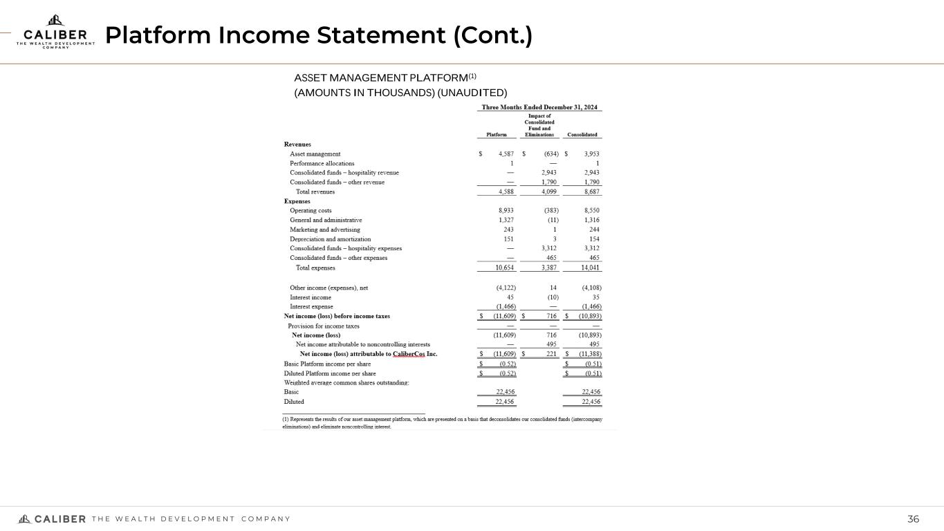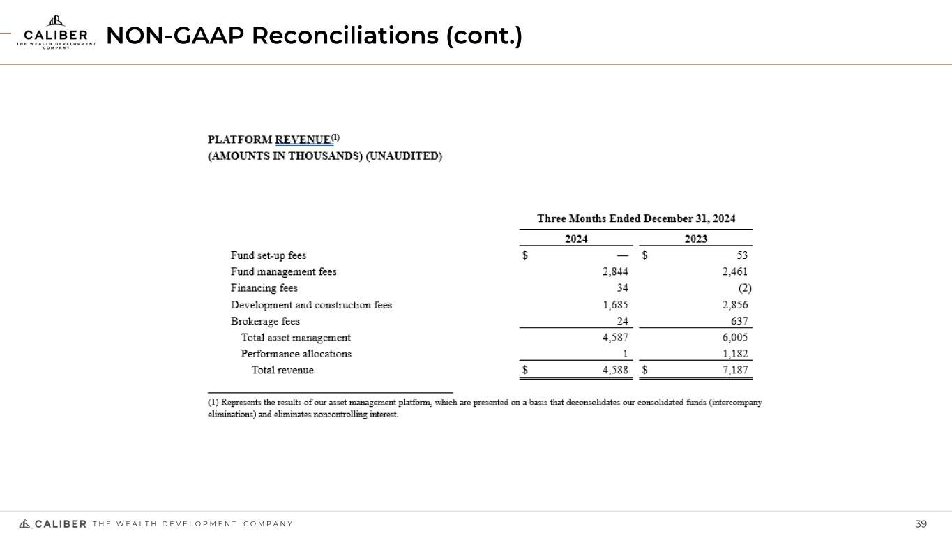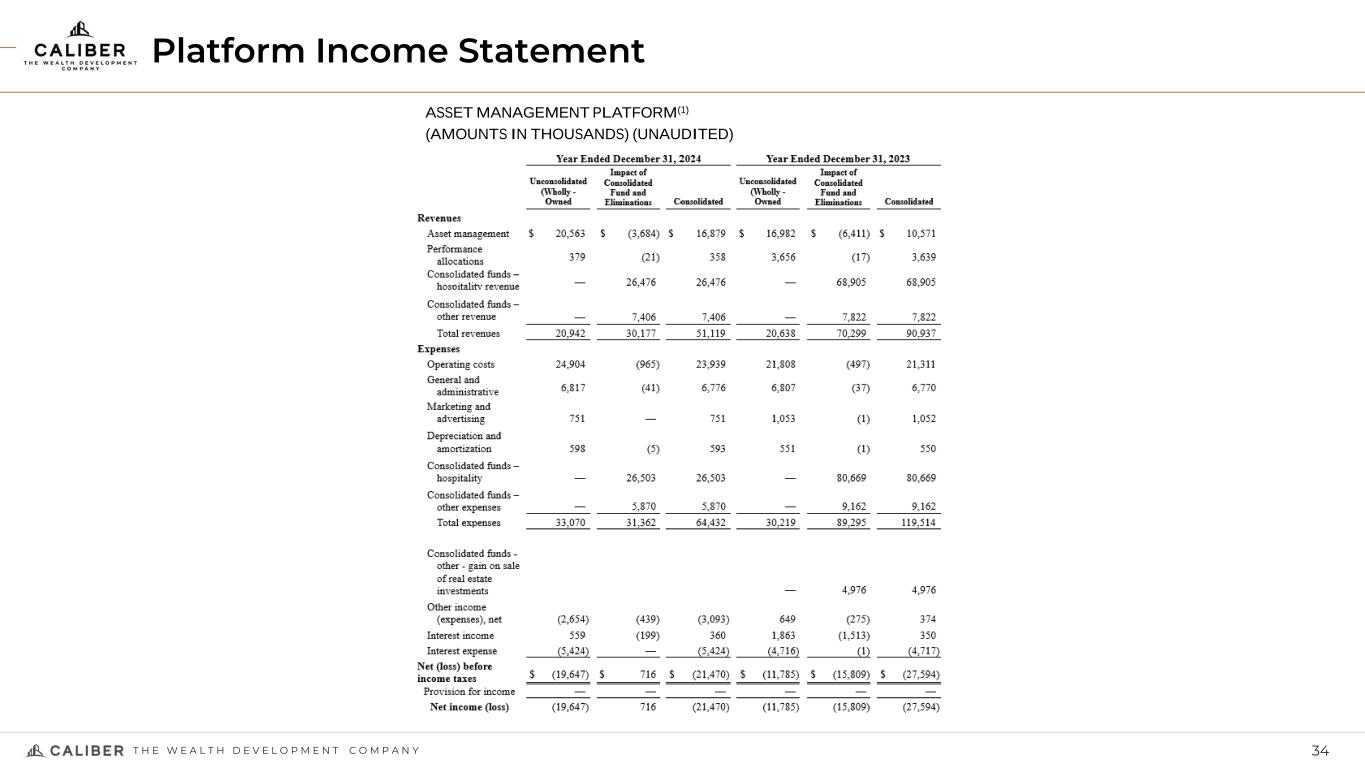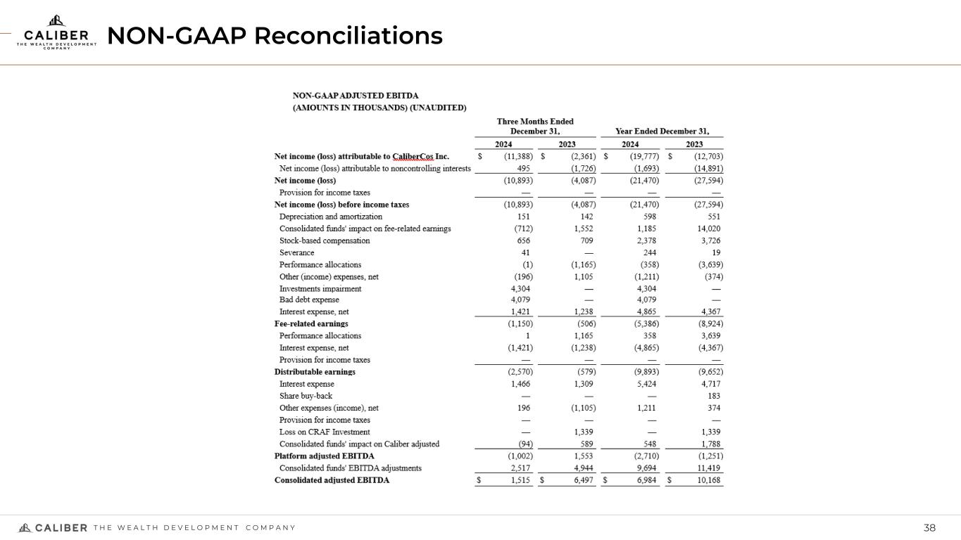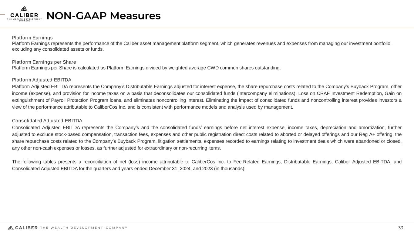 33T H E W E A L T H D E V E L O P M E N T C O M P A N Y Platform Earnings Platform Earnings represents the performance of the Caliber asset management platform segment, which generates revenues and expenses from managing our investment portfolio, excluding any consolidated assets or funds. Platform Earnings per Share Platform Earnings per Share is calculated as Platform Earnings divided by weighted average CWD common shares outstanding. Platform Adjusted EBITDA Platform Adjusted EBITDA represents the Company’s Distributable Earnings adjusted for interest expense, the share repurchase costs related to the Company’s Buyback Program, other income (expense), and provision for income taxes on a basis that deconsolidates our consolidated funds (intercompany eliminations), Loss on CRAF Investment Redemption, Gain on extinguishment of Payroll Protection Program loans, and eliminates noncontrolling interest. Eliminating the impact of consolidated funds and noncontrolling interest provides investors a view of the performance attributable to CaliberCos Inc. and is consistent with performance models and analysis used by management. Consolidated Adjusted EBITDA Consolidated Adjusted EBITDA represents the Company’s and the consolidated funds’ earnings before net interest expense, income taxes, depreciation and amortization, further adjusted to exclude stock-based compensation, transaction fees, expenses and other public registration direct costs related to aborted or delayed offerings and our Reg A+ offering, the share repurchase costs related to the Company’s Buyback Program, litigation settlements, expenses recorded to earnings relating to investment deals which were abandoned or closed, any other non-cash expenses or losses, as further adjusted for extraordinary or non-recurring items. The following tables presents a reconciliation of net (loss) income attributable to CaliberCos Inc. to Fee-Related Earnings, Distributable Earnings, Caliber Adjusted EBITDA, and Consolidated Adjusted EBITDA for the quarters and years ended December 31, 2024, and 2023 (in thousands): NON-GAAP Measures
