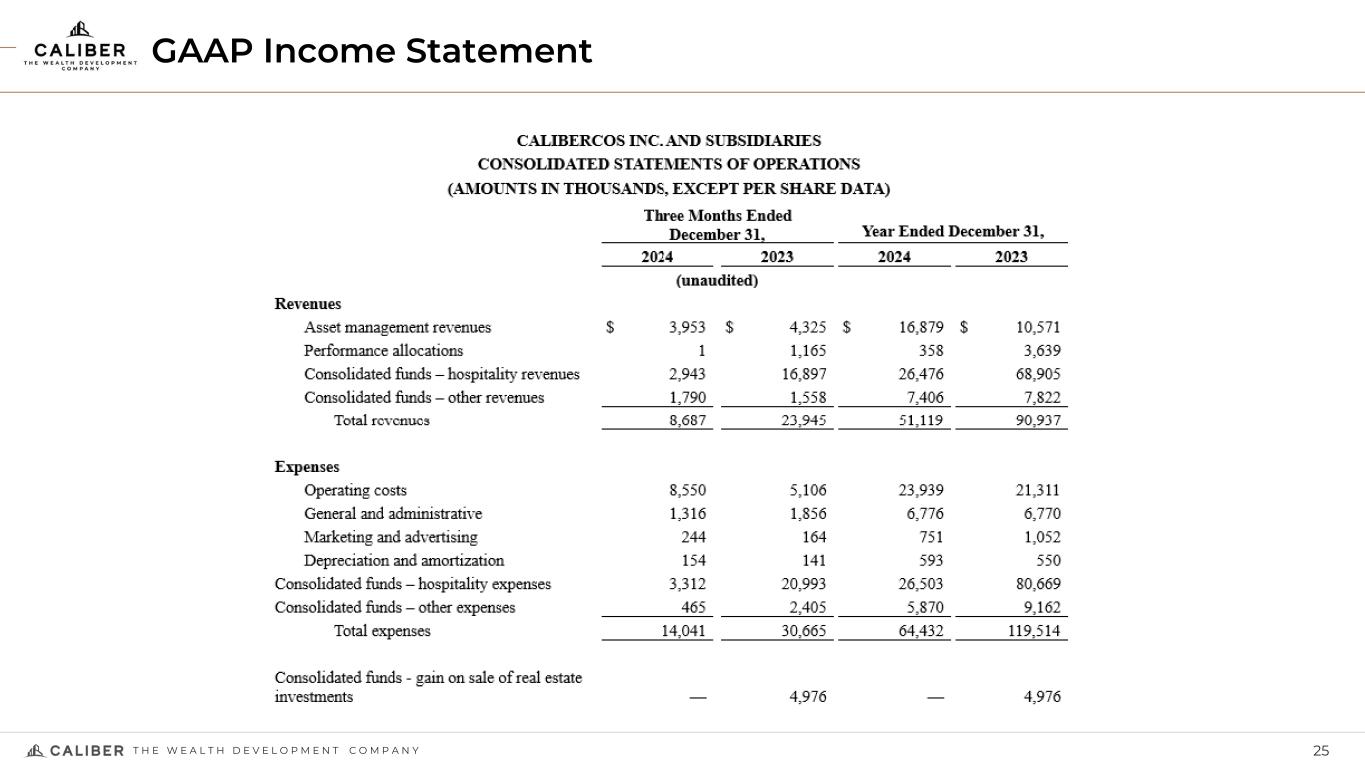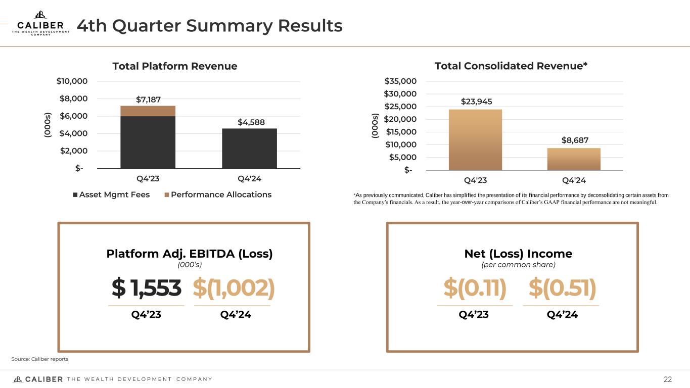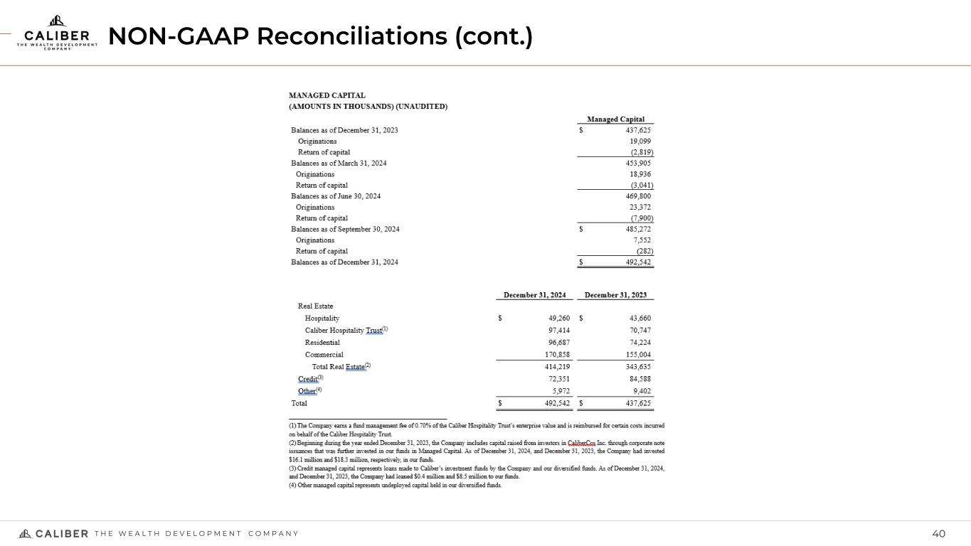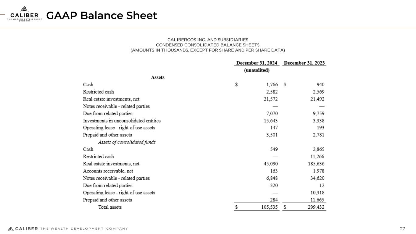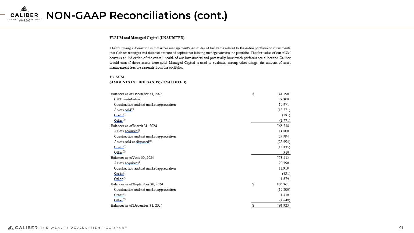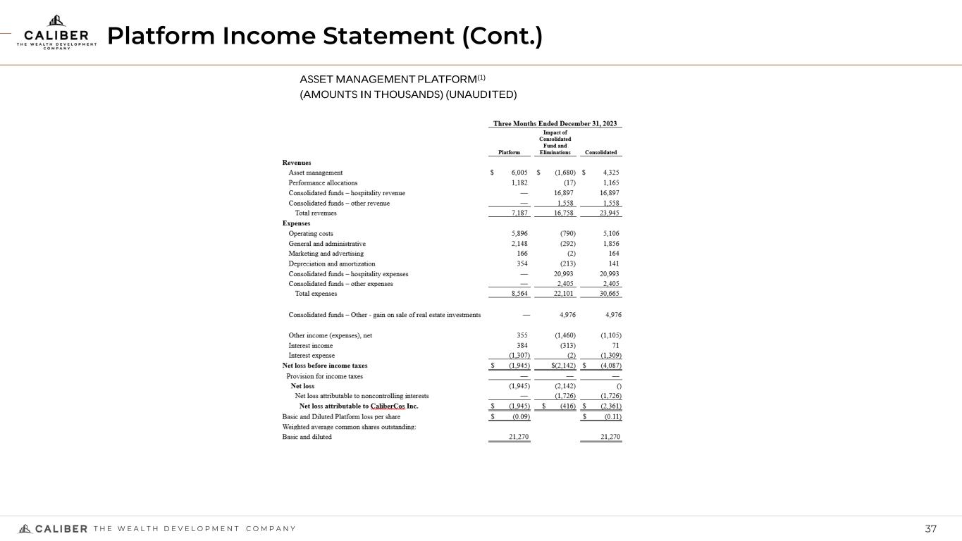 33T H E W E A L T H D E V E L O P M E N T C O M P A N Y Platform Earnings Platform Earnings represents the performance of the Caliber asset management platform segment, which generates revenues and expenses from managing our investment portfolio, excluding any consolidated assets or funds. Platform Earnings per Share Platform Earnings per Share is calculated as Platform Earnings divided by weighted average CWD common shares outstanding. Platform Adjusted EBITDA Platform Adjusted EBITDA represents the Company’s Distributable Earnings adjusted for interest expense, the share repurchase costs related to the Company’s Buyback Program, other income (expense), and provision for income taxes on a basis that deconsolidates our consolidated funds (intercompany eliminations), Loss on CRAF Investment Redemption, Gain on extinguishment of Payroll Protection Program loans, and eliminates noncontrolling interest. Eliminating the impact of consolidated funds and noncontrolling interest provides investors a view of the performance attributable to CaliberCos Inc. and is consistent with performance models and analysis used by management. Consolidated Adjusted EBITDA Consolidated Adjusted EBITDA represents the Company’s and the consolidated funds’ earnings before net interest expense, income taxes, depreciation and amortization, further adjusted to exclude stock-based compensation, transaction fees, expenses and other public registration direct costs related to aborted or delayed offerings and our Reg A+ offering, the share repurchase costs related to the Company’s Buyback Program, litigation settlements, expenses recorded to earnings relating to investment deals which were abandoned or closed, any other non-cash expenses or losses, as further adjusted for extraordinary or non-recurring items. The following tables presents a reconciliation of net (loss) income attributable to CaliberCos Inc. to Fee-Related Earnings, Distributable Earnings, Caliber Adjusted EBITDA, and Consolidated Adjusted EBITDA for the quarters and years ended December 31, 2024, and 2023 (in thousands): NON-GAAP Measures