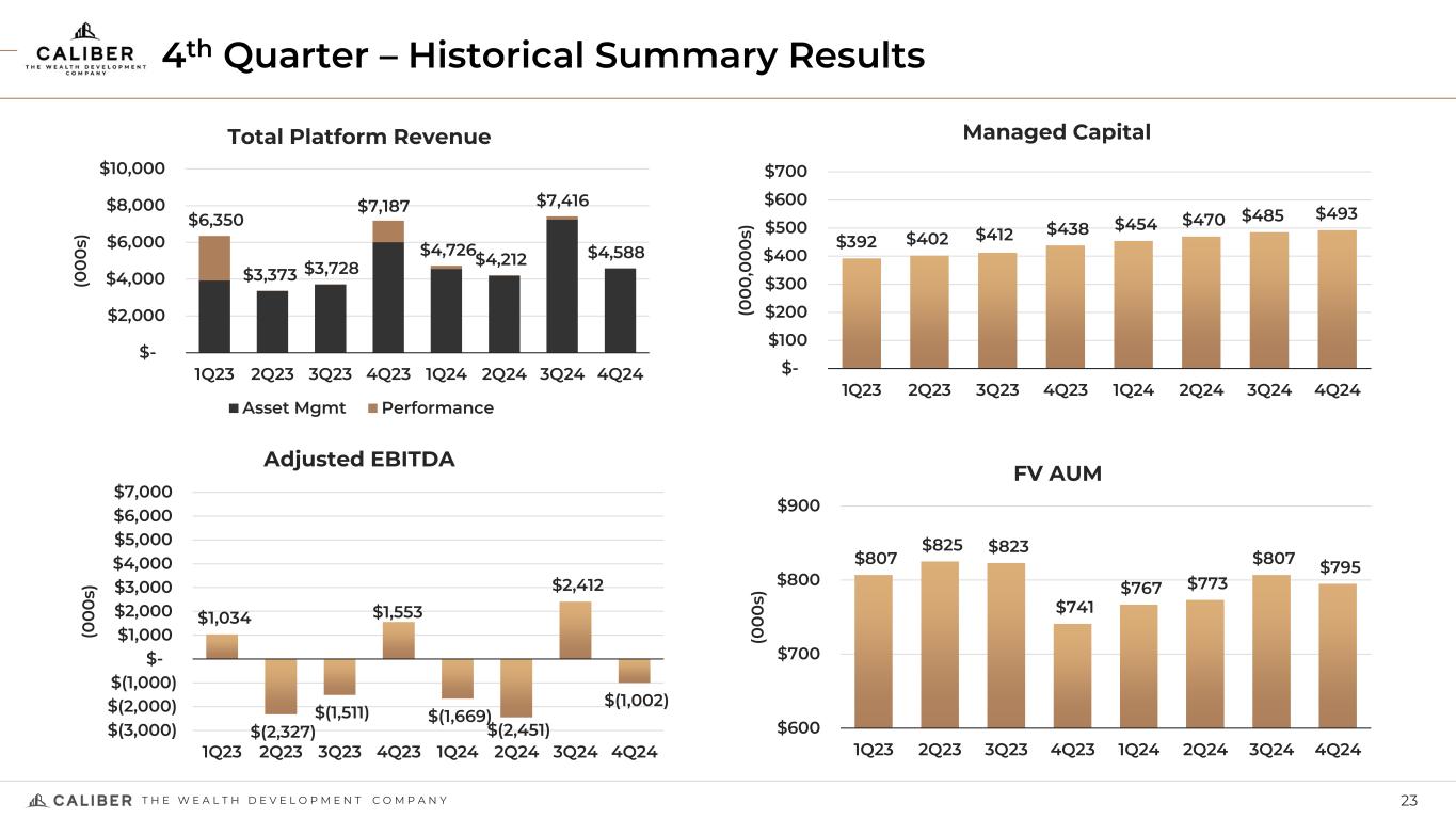 $23,945 $8,687 $- $5,000 $10,000 $15,000 $20,000 $25,000 $30,000 $35,000 Q4'23 Q4'24 (0 0 0 s) Total Consolidated Revenue* 4th Quarter Summary Results 22T H E W E A L T H D E V E L O P M E N T C O M P A N Y Source: Caliber reports Net (Loss) Income (per common share) $(0.11) Q4’23 $(0.51) Q4’24 $7,187 $4,588 $- $2,000 $4,000 $6,000 $8,000 $10,000 Q4'23 Q4'24 (0 0 0 s) Total Platform Revenue Asset Mgmt Fees Performance Allocations Platform Adj. EBITDA (Loss) (000’s) $ 1,553 Q4’23 $(1,002) Q4’24 *As previously communicated, Caliber has simplified the presentation of its financial performance by deconsolidating certain assets from the Company’s financials. As a result, the year-over-year comparisons of Caliber’s GAAP financial performance are not meaningful.