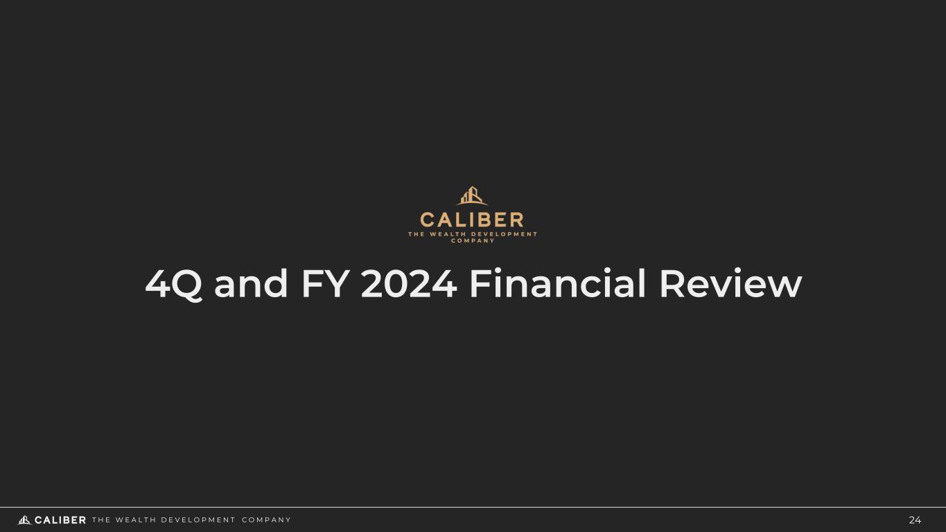 4th Quarter – Historical Summary Results 23T H E W E A L T H D E V E L O P M E N T C O M P A N Y $392 $402 $412 $438 $454 $470 $485 $493 $- $100 $200 $300 $400 $500 $600 $700 1Q23 2Q23 3Q23 4Q23 1Q24 2Q24 3Q24 4Q24 (0 0 0 ,0 0 0 s) Managed Capital $1,034 $(2,327) $(1,511) $1,553 $(1,669) $(2,451) $2,412 $(1,002) $(3,000) $(2,000) $(1,000) $- $1,000 $2,000 $3,000 $4,000 $5,000 $6,000 $7,000 1Q23 2Q23 3Q23 4Q23 1Q24 2Q24 3Q24 4Q24 (0 0 0 s) Adjusted EBITDA $6,350 $3,373 $3,728 $7,187 $4,726 $4,212 $7,416 $4,588 $- $2,000 $4,000 $6,000 $8,000 $10,000 1Q23 2Q23 3Q23 4Q23 1Q24 2Q24 3Q24 4Q24 (0 0 0 s) Total Platform Revenue Asset Mgmt Performance $807 $825 $823 $741 $767 $773 $807 $795 $600 $700 $800 $900 1Q23 2Q23 3Q23 4Q23 1Q24 2Q24 3Q24 4Q24 (0 0 0 s) FV AUM