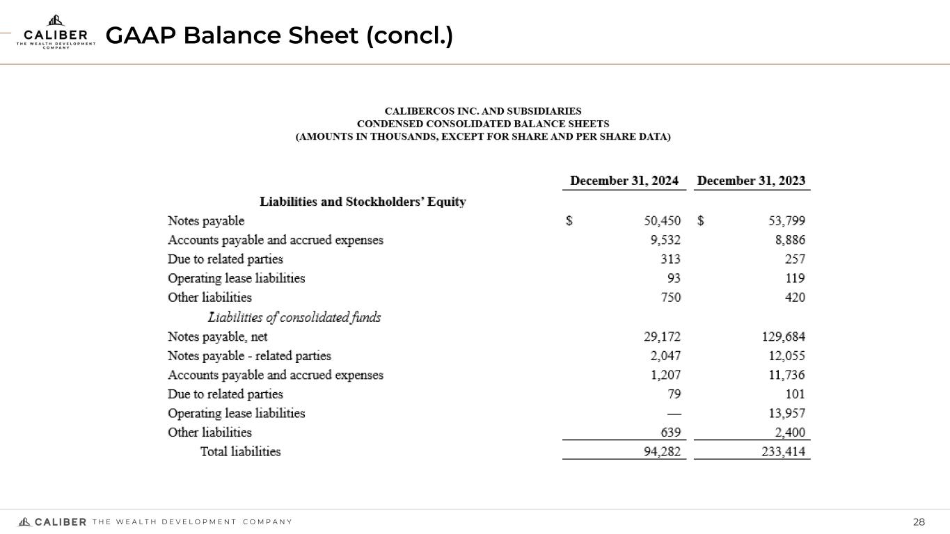 GAAP Balance Sheet 27T H E W E A L T H D E V E L O P M E N T C O M P A N Y CALIBERCOS INC. AND SUBSIDIARIES CONDENSED CONSOLIDATED BALANCE SHEETS (AMOUNTS IN THOUSANDS, EXCEPT FOR SHARE AND PER SHARE DATA)