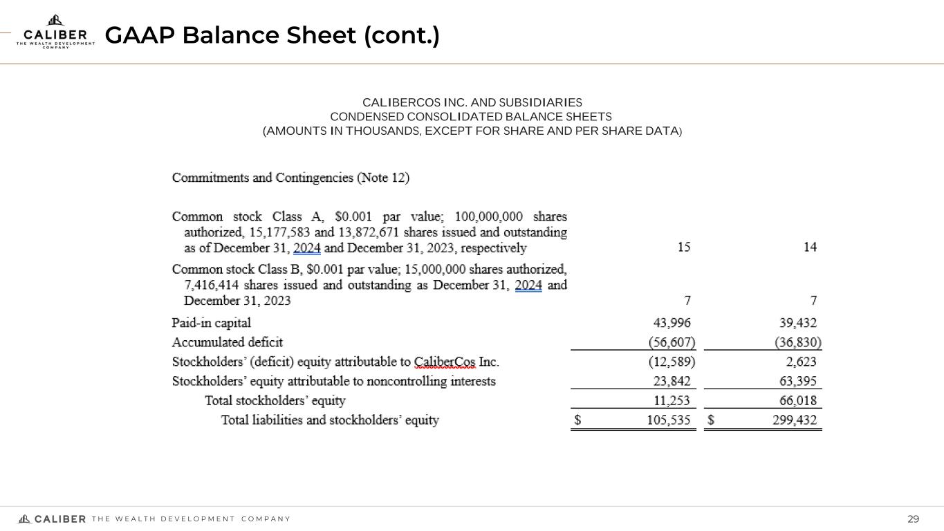 GAAP Balance Sheet (cont.) 29T H E W E A L T H D E V E L O P M E N T C O M P A N Y CALIBERCOS INC. AND SUBSIDIARIES CONDENSED CONSOLIDATED BALANCE SHEETS (AMOUNTS IN THOUSANDS, EXCEPT FOR SHARE AND PER SHARE DATA)