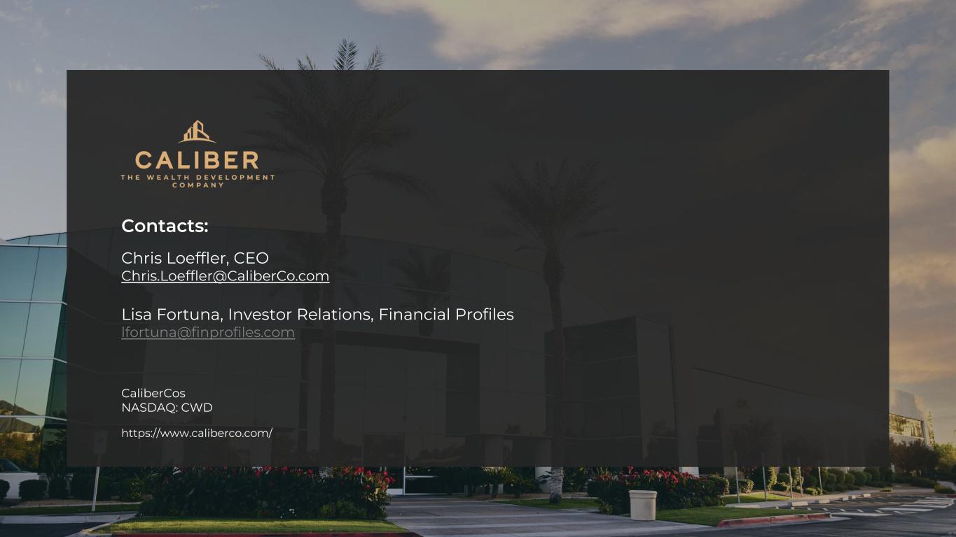 https://www.caliberco.com/ CaliberCos NASDAQ: CWD Contacts: Chris Loeffler, CEO Chris.Loeffler@CaliberCo.com Lisa Fortuna, Investor Relations, Financial Profiles lfortuna@finprofiles.com