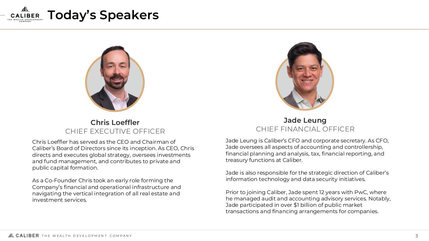 Forward-Looking Statements This presentation includes statements concerning CaliberCos Inc.’s (the “Company,” or “Caliber”) expectations, beliefs, plans, objectives, goals, strategies, assumptions of future events, future financial performance, or growth and other statements that are not historical facts. These statements are "forward-looking statements" within the meaning of the Private Securities Litigation Reform Act of 1995. In some cases, readers and the audience can identify these forward-looking statements through the use of words or phrases such as "estimate,“ "expect," "anticipate," "intend," "plan," "project," "believe," "forecast," "should," "could," and other similar expressions. Forward-looking statements involve risks and uncertainties that may cause actual results or outcomes to differ materially from those included in the forward-looking statements. The Company's expectations, beliefs, and projections are expressed in good faith and are believed by the Company to have a reasonable basis, but there can be no assurance that management's expectations, beliefs, or projections will be achieved or accomplished. Factors that may cause actual results to differ materially from those included in the forward-looking statements include, but are not limited to, factors affecting the Company’s ability to successfully operate and manage its business, including, among others, title disputes, weather conditions, shortages, delays, or unavailability of equipment and services, property management, brokerage, investment and fund operations, the need to obtain governmental approvals and permits, and compliance with environmental laws and regulations; changes in costs of operations; loss of markets; volatility of asset prices; imprecision of asset valuations; environmental risks; competition; inability to access sufficient capital; general economic conditions; litigation; changes in regulation and legislation; economic disruptions or uninsured losses resulting from major accidents, fires, severe weather, natural disasters, terrorist activities, acts of war, cyber attacks, or pest infestation; increasing costs of insurance, changes in coverage and the ability to obtain insurance; and other presently unknown or unforeseen factors. Other risk factors are detailed from time to time in the Company's reports filed with the Securities and Exchange Commission. Any forward-looking statement speaks only as of the date on which such statement is made, and the Company undertakes no obligation to update the information contained in any forward-looking statements to reflect developments or circumstances occurring after the statement is made or to reflect the occurrence of unanticipated events. Past performance is not indicative of future results. There is no guarantee that any specific outcome will be achieved. Investment may be speculative and illiquid and there is a total risk of loss. There is no guarantee that any specific investment will be suitable or profitable. This presentation does not constitute an offering of, nor does it constitute the solicitation of an offer to buy, securities of the Company. This presentation is provided solely to introduce the Company to the recipient and to determine whether the recipient would like additional information regarding the Company and its anticipated plans. Any investment in the Company or sale of its securities will only take place pursuant to an appropriate, private placement memorandum and a detailed subscription agreement. Some of the information contained herein is confidential and proprietary to the Company and the presentation is provided to the recipient with the express understanding that without the prior written permission of the Issuer, such recipient will not distribute or release the information contained herein, make reproductions of, or use it for any purpose other than determining whether the recipient wishes additional information regarding the Company or its plans. By accepting delivery of this presentation, the recipient agrees to return same to the Company if the recipient does not wish to receive any further information regarding the Company. We have filed a registration statement (including a preliminary prospectus) with the SEC for the offering to which this communication relates. The registration statement has not yet become effective. Before you invest, you should read the preliminary prospectus in that registration statement (including the risk factors described therein) and other documents that we have filed with the SEC for more complete information. You may access these documents for free by visiting Edgar on the SEC website at httpp://www.sec.gov CALIBERCO.COM | 8901 E MOUNTAIN VIEW RD, STE 150, SCOTTSDALE, AZ 85258 | 480.295.7600 2 T H E W E A L T H D E V E L O P M E N T C O M P A N Y Disclaimers