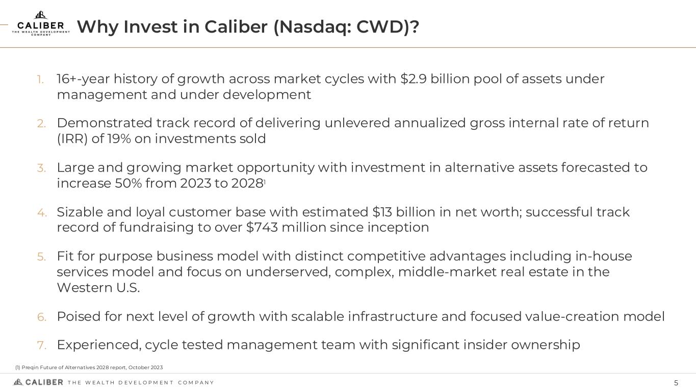1. 16+-year history of growth across market cycles with $2.9 billion pool of assets under management and under development 2. Demonstrated track record of delivering unlevered annualized gross internal rate of return (IRR) of 19% on investments sold 3. Large and growing market opportunity with investment in alternative assets forecasted to increase 50% from 2023 to 20281 4. Sizable and loyal customer base with estimated $13 billion in net worth; successful track record of fundraising to over $743 million since inception 5. Fit for purpose business model with distinct competitive advantages including in-house services model and focus on underserved, complex, middle-market real estate in the Western U.S. 6. Poised for next level of growth with scalable infrastructure and focused value-creation model 7. Experienced, cycle tested management team with significant insider ownership Why Invest in Caliber (Nasdaq: CWD)? 5T H E W E A L T H D E V E L O P M E N T C O M P A N Y (1) Preqin Future of Alternatives 2028 report, October 2023