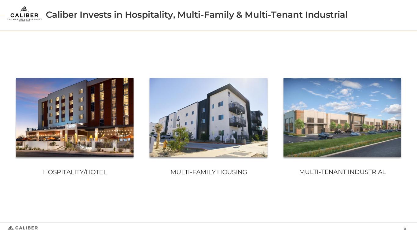 8 HOSPITALITY/HOTEL MULTI-FAMILY HOUSING MULTI-TENANT INDUSTRIAL Caliber Invests in Hospitality, Multi-Family & Multi-Tenant Industrial