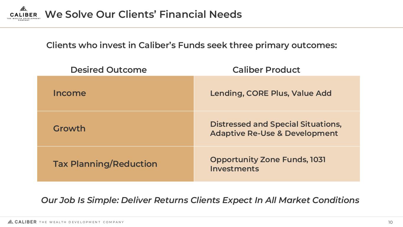 9T H E W E A L T H D E V E L O P M E N T C O M P A N Y The Best Opportunities are in the Middle-Market Middle-Market Assets • $5 to $50 million per project • Large opportunity set • Highly-fragmented market • Less competition • Caliber’s in-house services model enables access Middle Market Geographies • Demonstrated Population & Job Growth • Underserved in terms of financing options • Opportunity Zone tax incentives • Local tax incentives • Trends post-pandemic