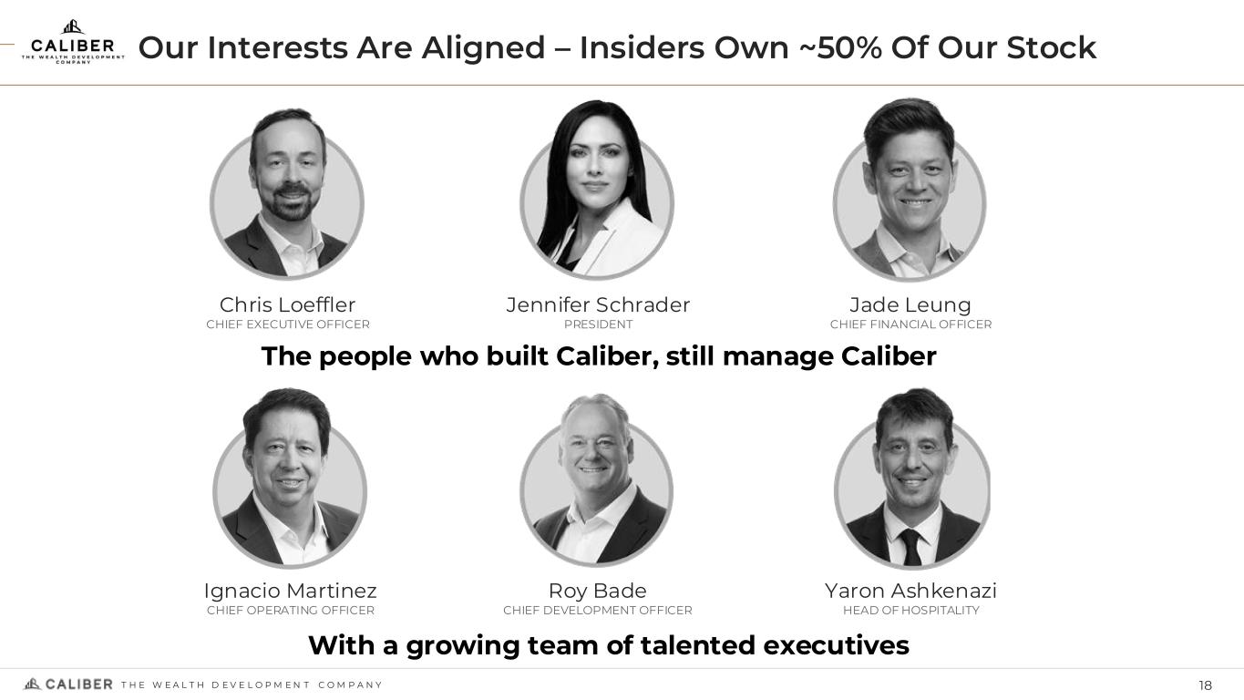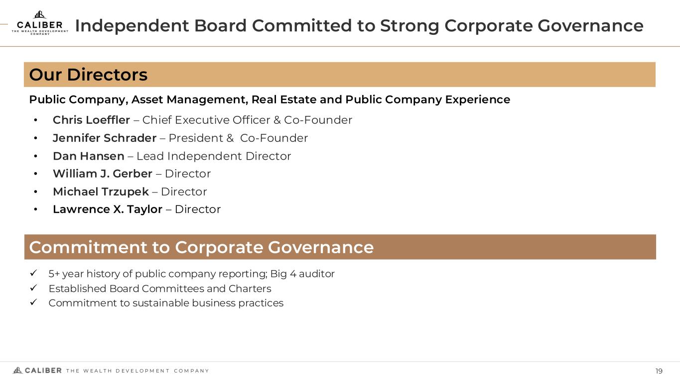 18T H E W E A L T H D E V E L O P M E N T C O M P A N Y The people who built Caliber, still manage Caliber Chris Loeffler CHIEF EXECUTIVE OFFICER Jennifer Schrader PRESIDENT Jade Leung CHIEF FINANCIAL OFFICER Roy Bade CHIEF DEVELOPMENT OFFICER With a growing team of talented executives Ignacio Martinez CHIEF OPERATING OFFICER Yaron Ashkenazi HEAD OF HOSPITALITY Our Interests Are Aligned – Insiders Own ~50% Of Our Stock